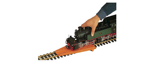 Mit dem Aufgleisgerät gelingt das Aufgleisen von LGB-Modellen kinderleicht: Aufgleisgerät auf ein Stück gerades LGB-Gleis aufsetzen und das Modell auf das Gleis schieben.