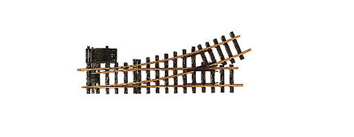 Gerades Gleis: 440 mm. Abzweigendes Gleis: links, R3, 22,5°. Der elektrische Weichenantrieb (LGB 12010) lässt sich links oder rechts an der Weiche montieren. Die Schaltung kann mit dem LGB-Stellpult (LGB 51755) o.ä. erfolgen