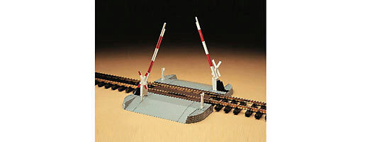 Die Bahnschranke lässt sich leicht in jedes gerade LGB-Gleis einsetzen. Das Gewicht des nahenden Zuges schließt die Schrankenbäume. Die Schranke wird geöffnet, wenn der letzte Wagen den Bahnübergang passiert hat.