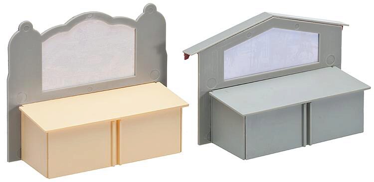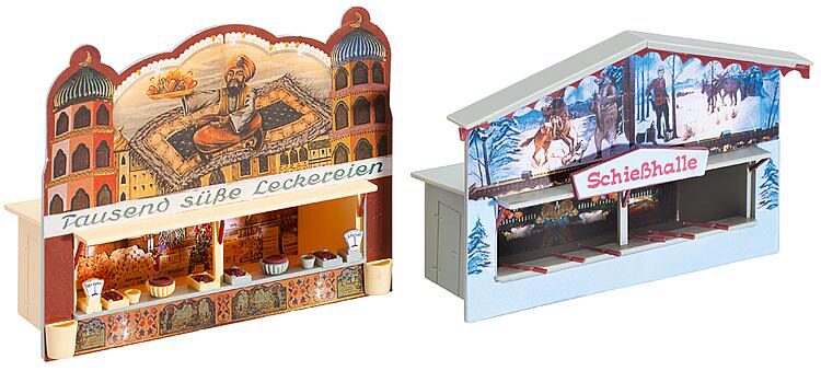 Mit den beiliegenden Frontdekorbildern und den Zubehör- und Ausschmückungsteilen für die Innengestaltung können die beiden Buden als Schießhalle und Stand mit »Tausend süßen Leckereien« gebaut werden. Die Stände sind mit den Birnchen aus Art. 180671-180676 beleuchtbar.