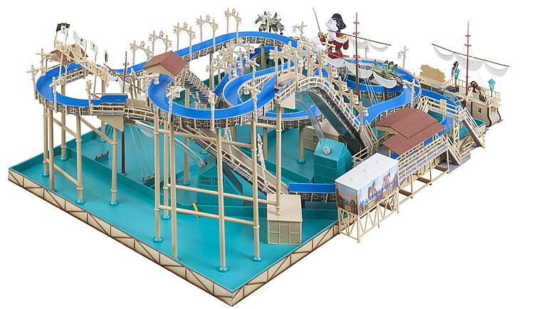 Den Wasserkreislauf bewerkstelligen zwei Wasserpumpen (12-16 V, Wechselspannung). Eine riesige Figur eines Piratenkapitäns, eine originalgetreue, bunte Dekoration und das passende Kassenhaus, sorgen für die richtige Atmosphäre. Nachträglich beleuchtbar.