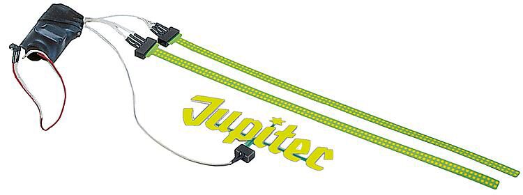 Lichtset passend zum »Jupiter«-Riesenrad (Art. 140470). Es lassen sich alle 36 Gondeln, der Jupiter-Schriftzug und die vorderen Stützstreben beleuchten. Zehn Lauflichtprogramme können gewählt werden. Zum Artikelumfang gehört ein Netzgerät (5 V, Gleichstrom). Die Montage ist auch noch nachträglich möglich.