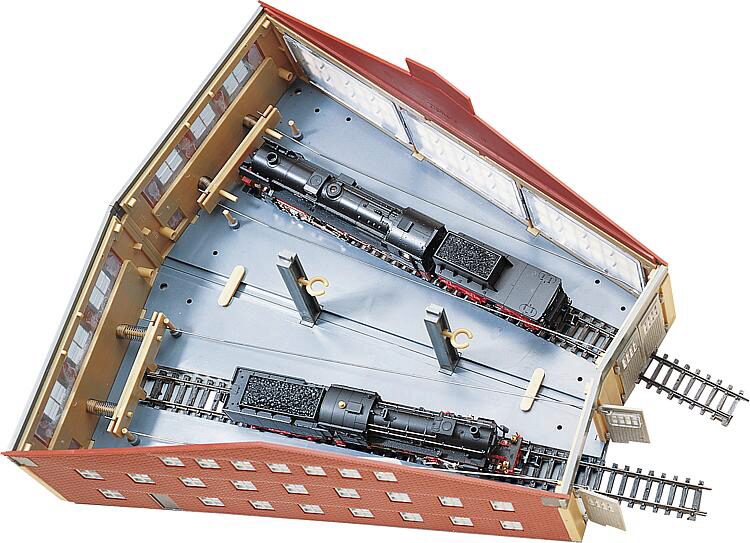 Das Modell kann durch zusätzliche Lokschuppen erweitert werden. Die Tore (Durchfahrtshöhe 40 mm) werden von der Lok über eine Prellbockmechanik geöffnet bzw. geschlossen. Für Loks bis 180 mm LüP. Gleisfächer 15°. Beleuchtung durch 2 Stecklampen MS 4 (baugleich: Märklin 60.000) ist möglich.