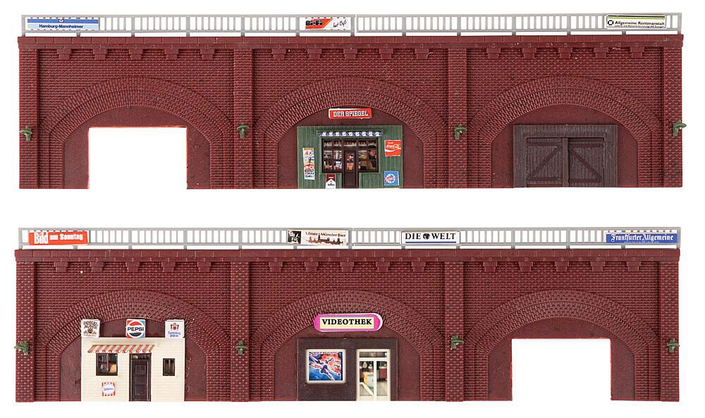 Arkaden mit Geschäften, die in den Mauerbogen eingebaut sind.