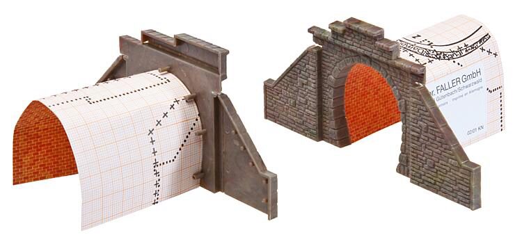 Tunnelportale für Dampf- und Oberleitungsbetrieb. 1-gleisig. Für Kurvenpassagen geeignet. Flügelmauern abknickbar. Mit Mauerplatte für Tunneleingänge.