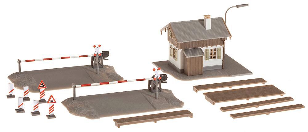 Bahnübergang mit Schrankenwärterhäuschen. Kann in ein- oder mehrgleisige Strecken eingebaut werden. Ohne Antrieb.