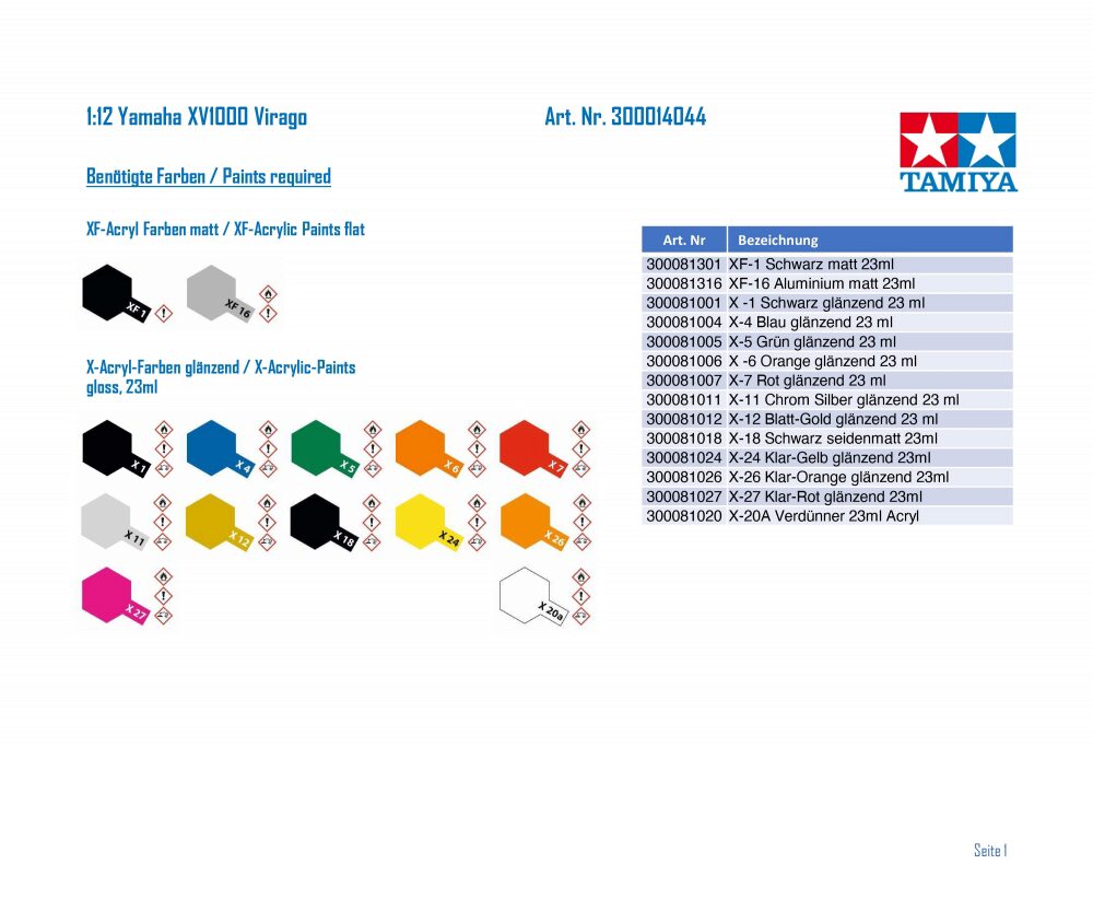 Die Yamaha XV1000 Virago ist eines der neuesten Vorzeigemodelle in Bezug auf den sogenannten „Chopper Stil. Dementsprechend ehrt TAMIYA dieses Motorrad und schafft mit dem Modellbaukasten eine hervorragende Passgenauigkeit als auch detaillierte Darstellung dieses Modells. Die Yamaha XV1000 Virago ist bekannt für Ihr angenehmes Fahrvergnügen und etabliert sich daher gegenüber den amerikanischen Marken als immer konkurrenzfähiger.