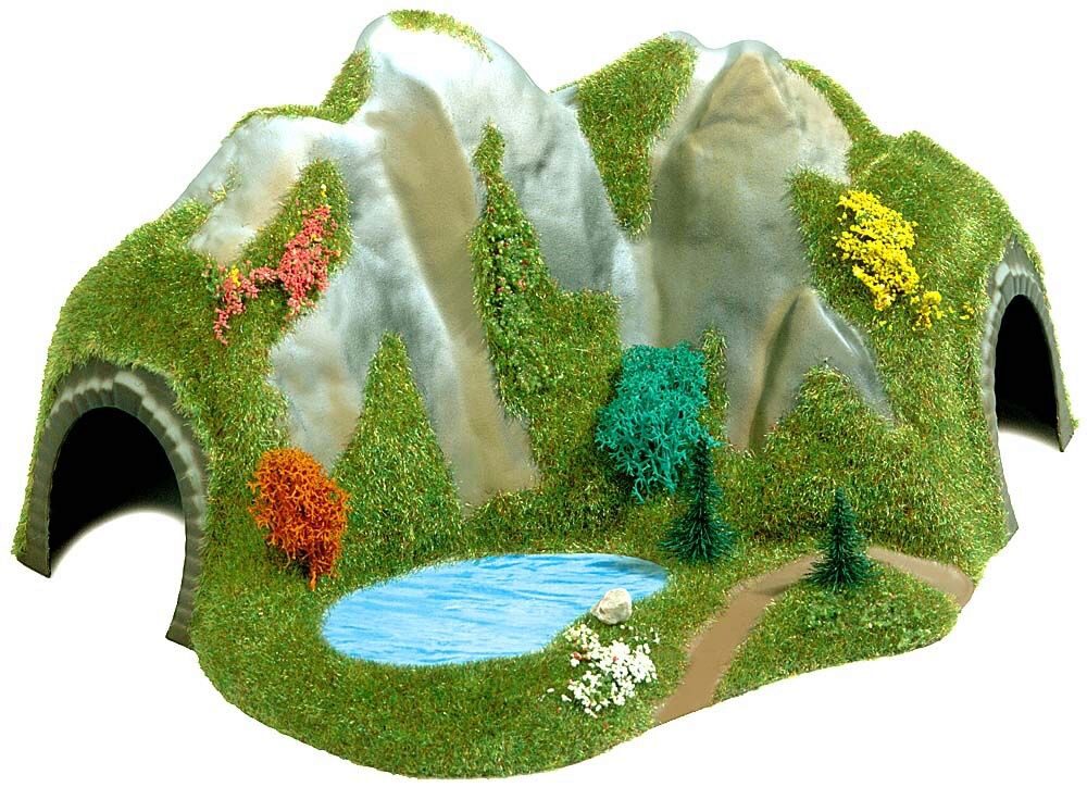 Mit See und steil aufragenden Felspartien für gebogene Strecken. Größe: 26 x 20 cm, 12 cm hoch.
