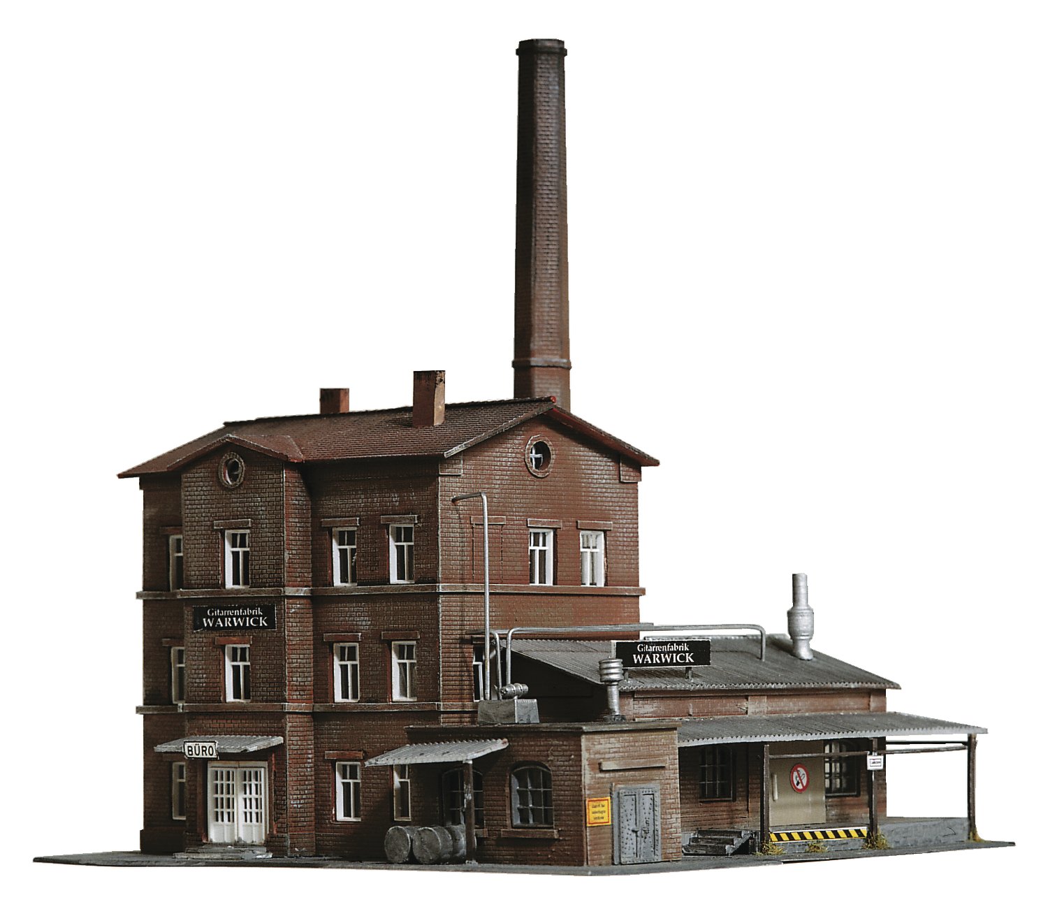 Das Industriegebäude ist durch seine verschachtelte Bauweise und die unterschiedlichen Dachformen besonders attraktiv. Die Laderampe kann durch ein Gleis angeschlossen werden. Zahlreiches Zubehör rundet diesen teilweise gealterten Bausatz ab.