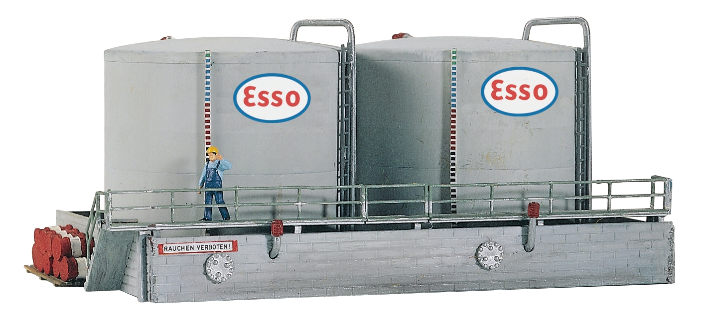 Tanklager mit zwei Vorratsbehältern zur Zwischenlagerung des mit Kesselwagen angelieferten Treibstoffes. Originalgetreue, gealterte Nachbildung der Kesselarmaturen, der Abfüllstutzen sowie der Ölauffangwanne.