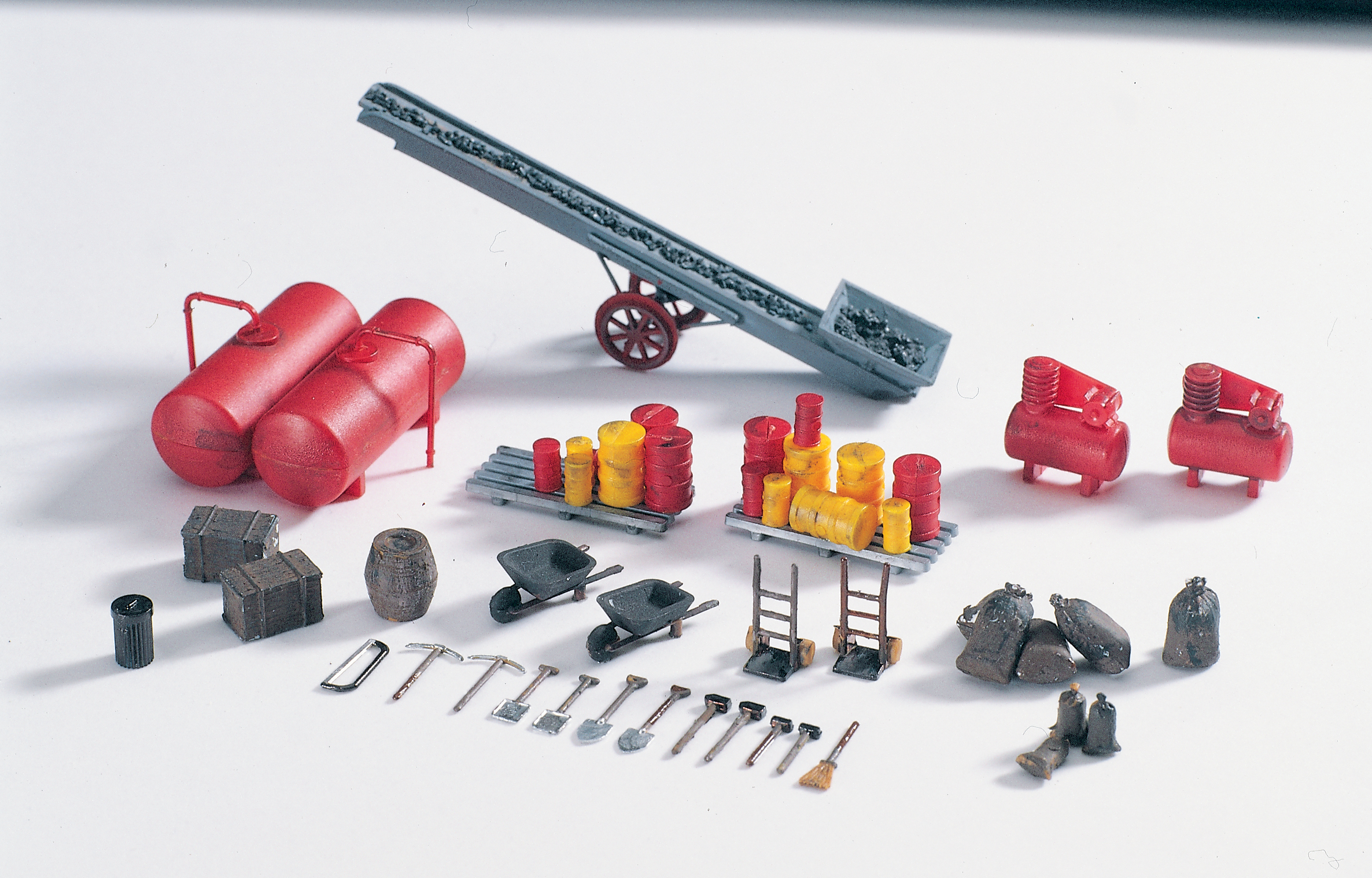 Dieser Bausatz enthält das typische Zubehör wie Förderband, Fässer, Sackkarren und Schubkarre. Dieser Zurüstsatz läßt keine Wünsche offen.