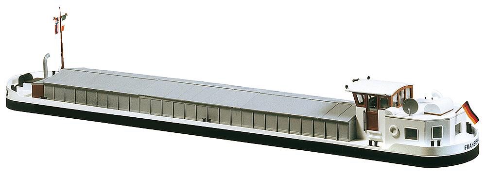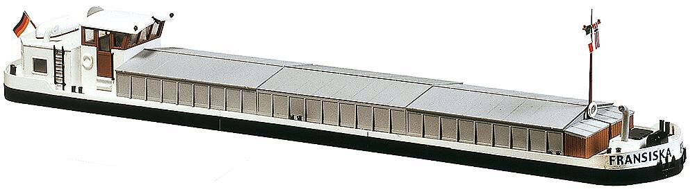 Ein Flussfrachtschiff wie es im Transportgewerbe auf den Binnenflüssen unterwegs ist. Abgedeckte Ladeluken, Steuerhaus und angebaute Wohnkajüte. Abgeflachter Rumpf. Nicht schwimmfähig.