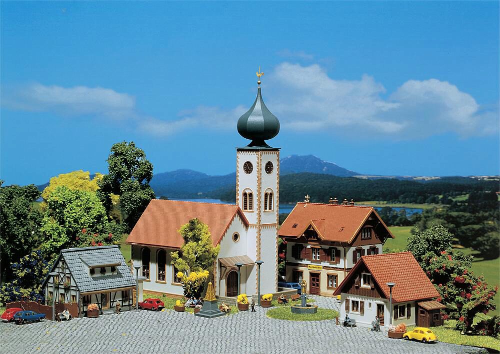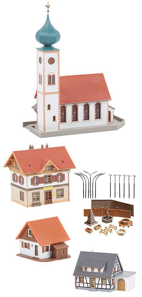Dorfset bestehend aus den Modellen Dorfkirche, Fachwerkhaus, Einfamilienhaus, Gaststätte und Dorfplatz-Ausschmückungsteilen.