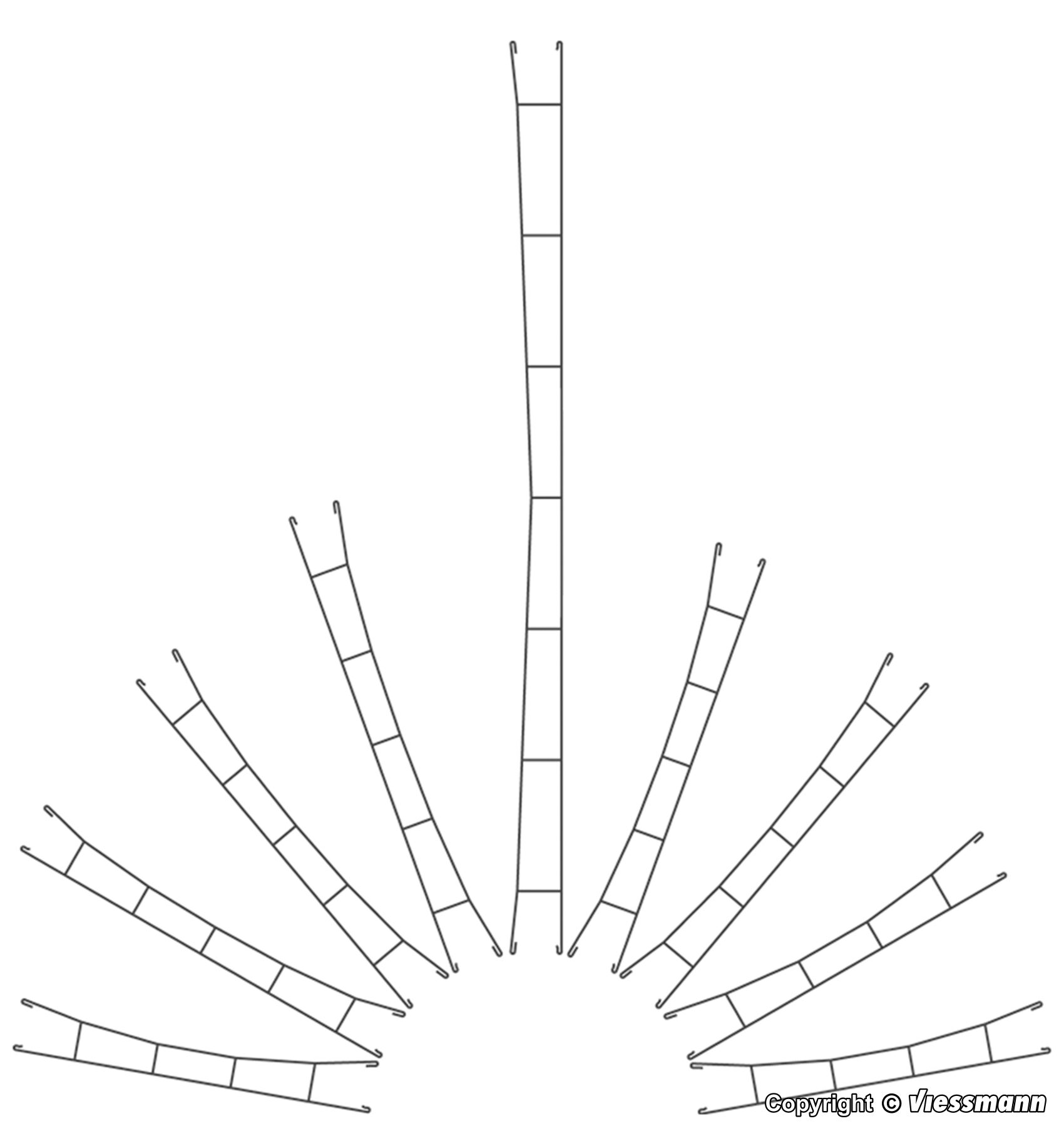 Fertig konfektionierter Fahrdraht mit Ösen zum einfachen Einhängen am Ausleger. Die unterschiedlichen Längen sind den gängigen Gleissystemen der Gleis-hersteller angepasst. Fahrdraht: Ø 0,6 mm. Geeignet für Fleischmann Profi-Gleis (Gleismittenradius 483,5 mm) und Roco LINE + Roco geoLINE (Gleismittenradius 481,2 mm).