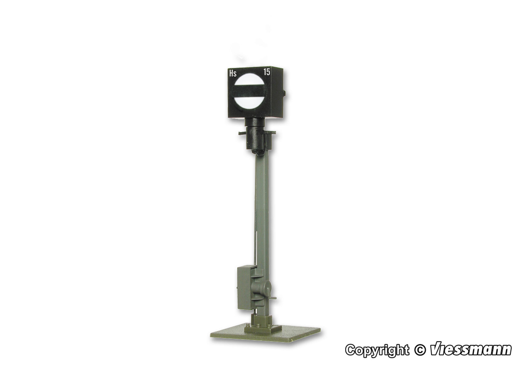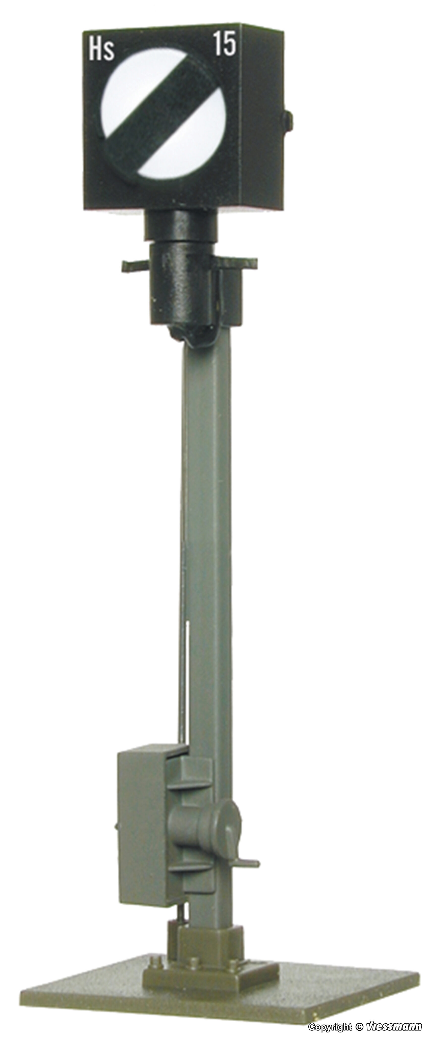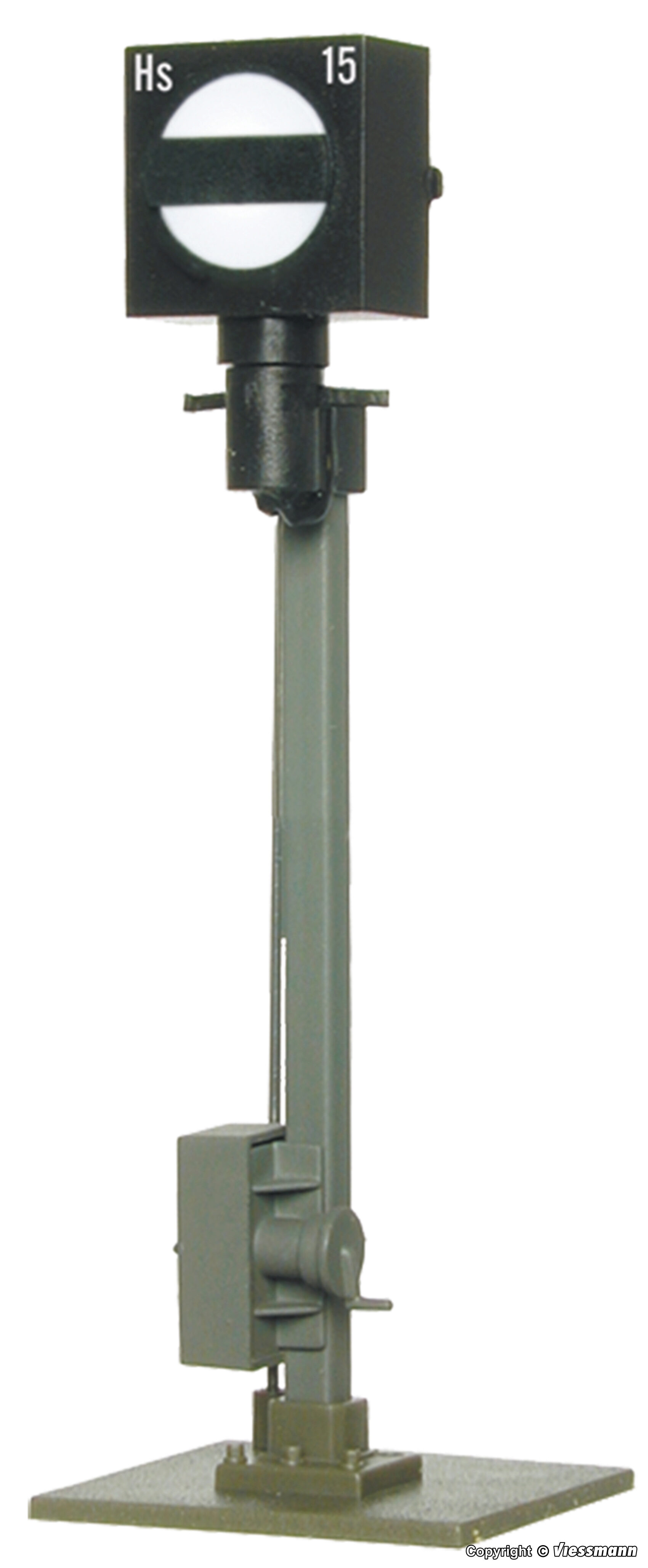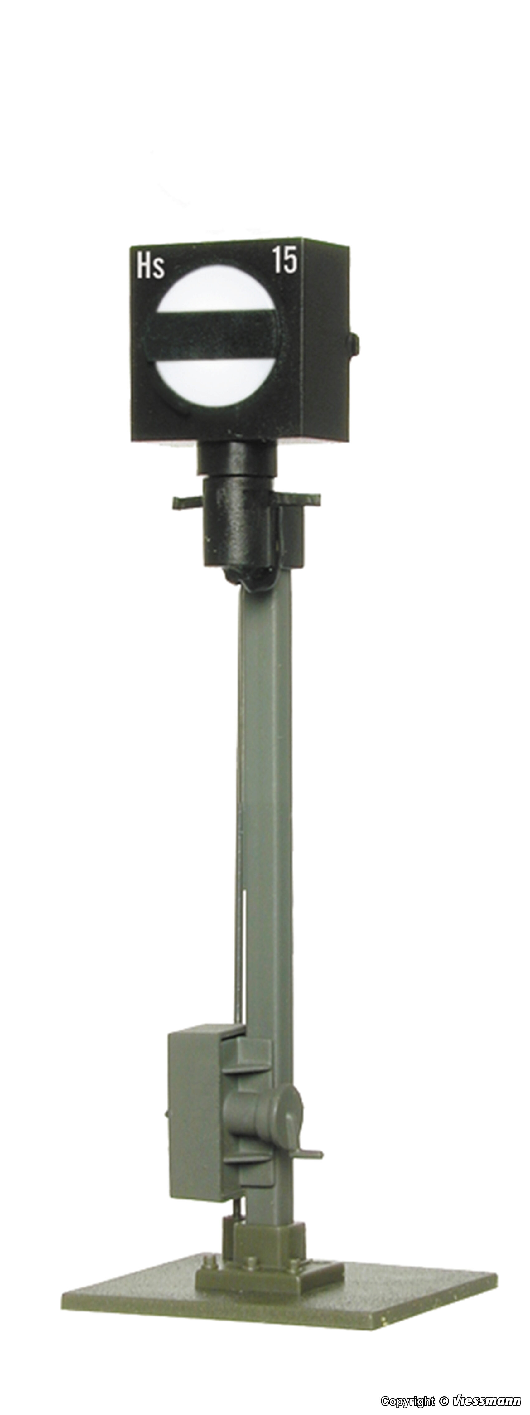 Mit filigranem Messingmast in originalgetreuer Lackierung und Unterflur-Kompaktantrieb. Die Blende ist beweglich und beleuchtet. Wartungsfrei dank LED-Beleuchtung. Bei der Bahn gibt es verschiedene Sperrsignal-Bauformen. Während das Sperrsignal Art. 4517 die Version mit Flanschfuß darstellt, welches an Gleisen einzeln steht, ist das Sperrsignal Art. 4515 die niedrigere Regelausführung. Es wird z. B. bei der Aufstellung direkt vor einem Hauptsignal verwendet. Signalbilder Sh0 und Sh1. Höhe: 5,5 cm.