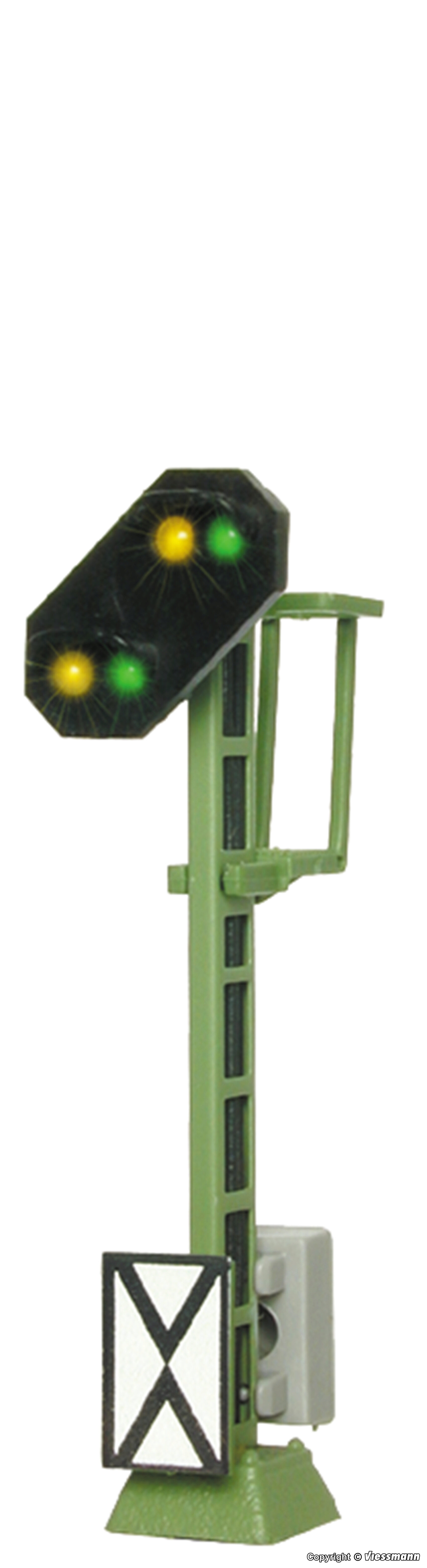 Signal der Einheitsbauart. Filigraner Messingmast in originalgetreuer Lackierung. Patentsteckfuß für einfache Montage. Mit 4 LEDs, wartungsfrei. Signalbilder Vr0, Vr1 und Vr2. Passendes Steuermodul: Art. 5220. Höhe: