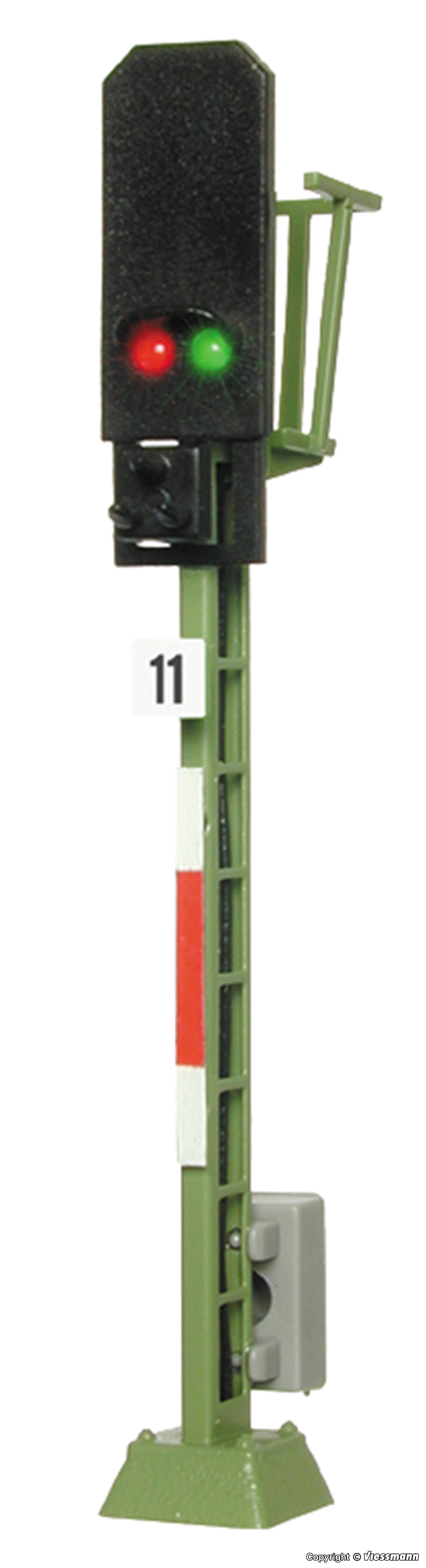 Signal der Einheitsbauart. Filigraner Messingmast in originalgetreuer Lackierung. Patentsteckfuß für einfache Montage. Mit 2 LEDs, wartungsfrei. Signalbilder Hp0 und Hp1. Passendes Steuermodul: Art. 5221. Höhe: 6,1 cm.