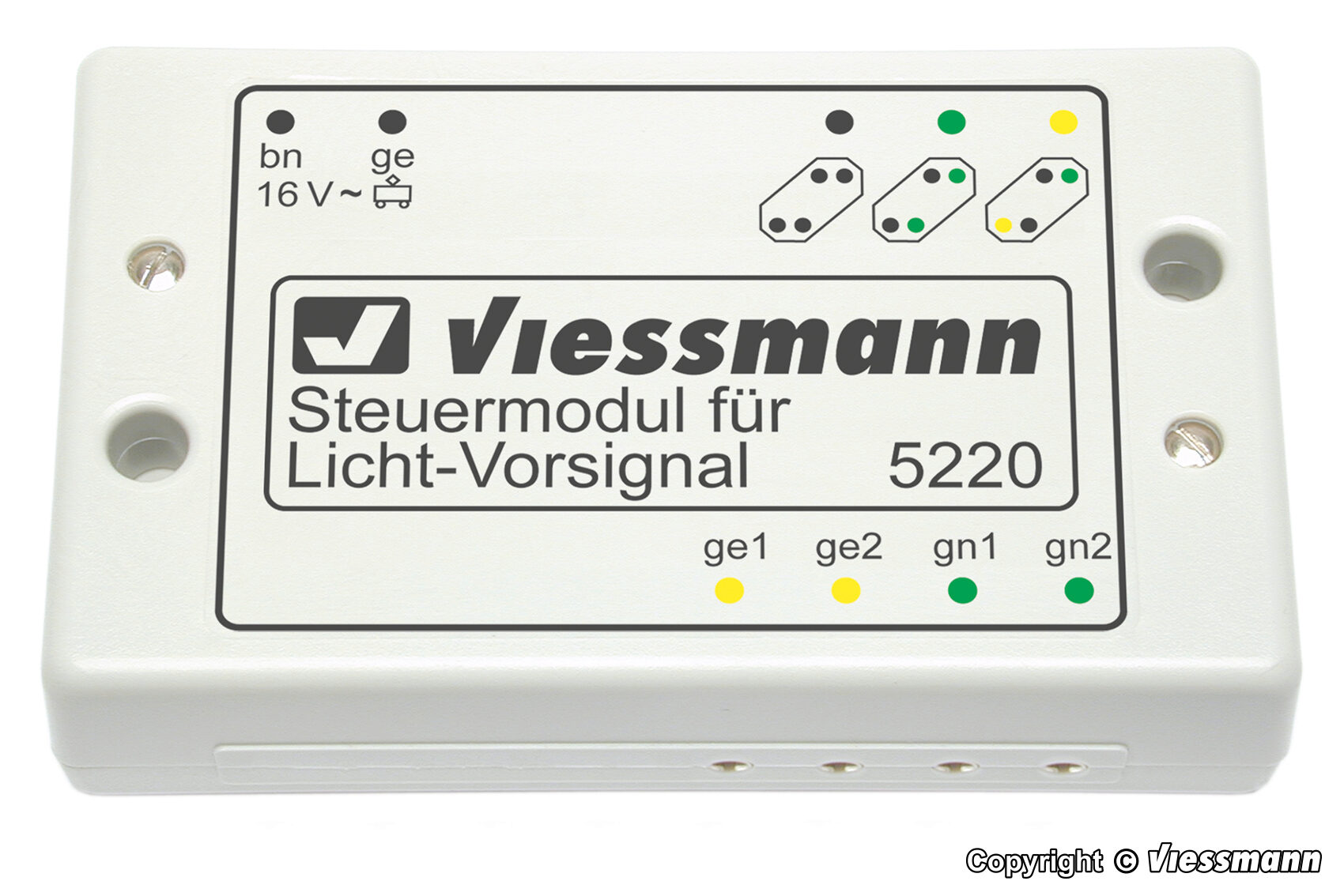 Geeignet in Verbindung mit den Steuermodulen für Lichtsignale Art. 5221 – 5223 und Hobby-Lichtsignalen Art. 4021, 4022. Das Modul erzeugt alle 3 möglichen Vorsignalbilder (Vr0, Vr1 und Vr2). Vorbildgerechter weicher Signalbildwechsel. Durch die Dunkeltastung wird bei Halt-zeigendem Hauptsignal ein am gleichen Mast befestigtes Vorsignal ausgeschaltet.