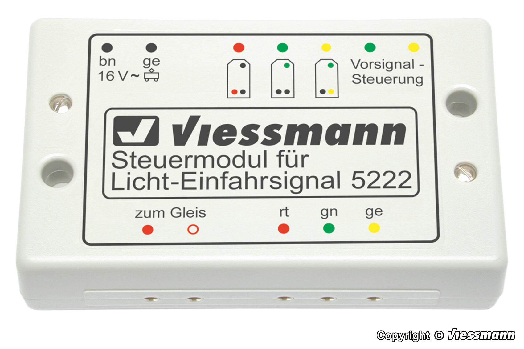 Geeignet für alle 3-begriffigen Licht-Einfahrsignale von Spur 0 bis Z (außer Signale mit Multiplex-Technologie). Das Modul erzeugt alle 3 möglichen Einfahrsignalbilder (Hp0, Hp1 und Hp2). Vorbildgerechter weicher Signalbildwechsel. Ein Kontakt für die Zugbeeinflussung ist integriert. Damit wird bei Halt-zeigendem Signal das Gleis vor dem Signal abgeschaltet. Die Ansteuerung erfolgt über das Tasten-Stellpult Art. 5546, Einzeltaster, Schaltgleise, Gleiskontakte oder digitale Magnetartikeldecoder. Zusätzlich ist ein Ausgang zur Steuerung eines Vorsignals über das Steuermodul Art. 5220 vorhanden.