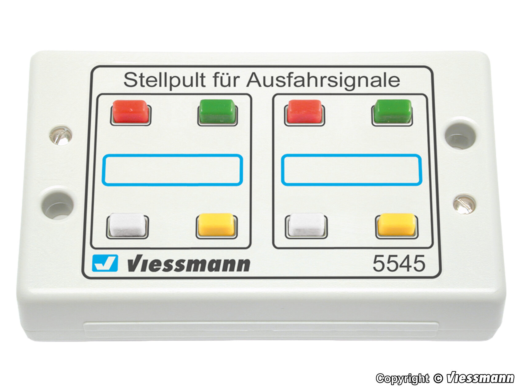 Mit Momentkontakt für zwei 4-begriffige Lichtsignale zum Schalten von Halt, Fahrt, Langsamfahrt und Rangierverbot aufgehoben über den Signalsteuerbaustein Art. 5210 und das Steuermodul für Licht-Ausfahrsignale Art. 5223. Im analogen Einsatz steuert das Stellpult auch die Steuermodule Art. 5224 und 5229, wenn daran 4-begriffige Signale angeschlossen sind. Mehrere Pulte können aneinandergereiht werden. Kontaktbelastbarkeit: 2 A.