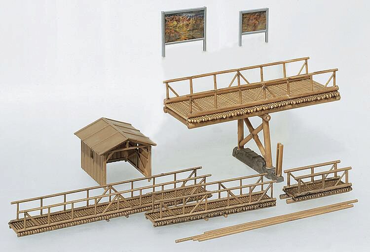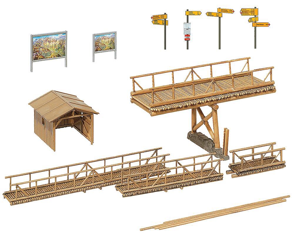 Die Packung enthält eine Wanderschutzhütte, Wanderwegschilder, eine Holzbrücke, Stege, Infotafeln – wichtige Schutz- und Orientierungselemente für den Wanderer.