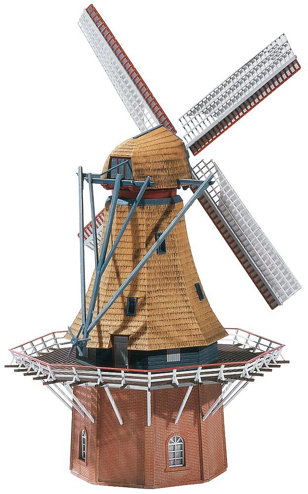 In friesischer Bauweise, mit gemauertem Unterbau, breiter Galerie und aufgesetzter Windmühle. Die mit Papiergewebe bespannten Windmühlenflügel werden durch den beigefügten Motor (12-16 V, Wechselspannung) angetrieben.