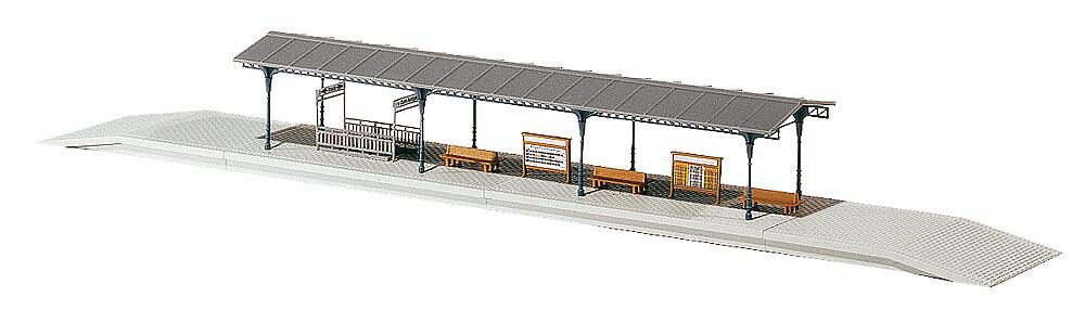 Bahnsteig, überdacht, mit Personenabgang, Auffahrtsschrägen und Zubehörteilen.