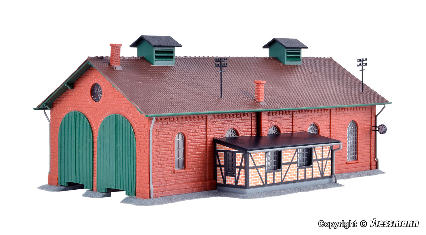 Bausatz. Lokschuppen in Backsteinbauweise mit kleinem Fachwerkanbau. Die Tore sind manuell beweglich. Maße: L 18,5 x B 10,5 x H 7,5 cm. Schwierigkeitsgrad: 2 (Fortgeschrittene).