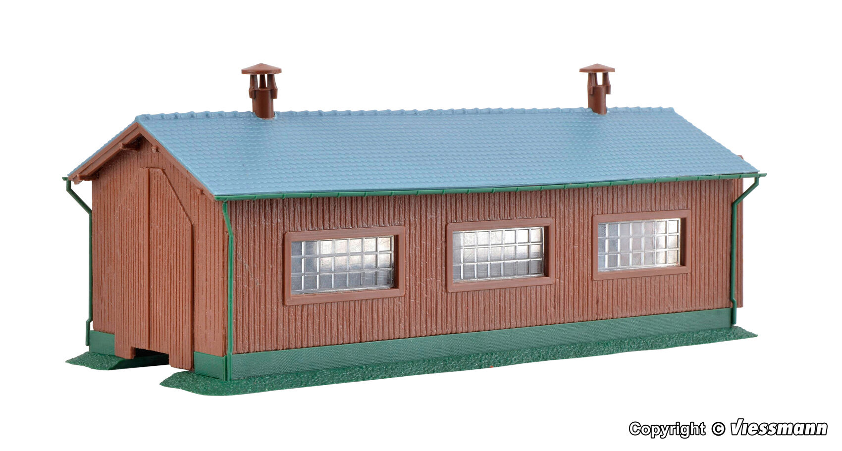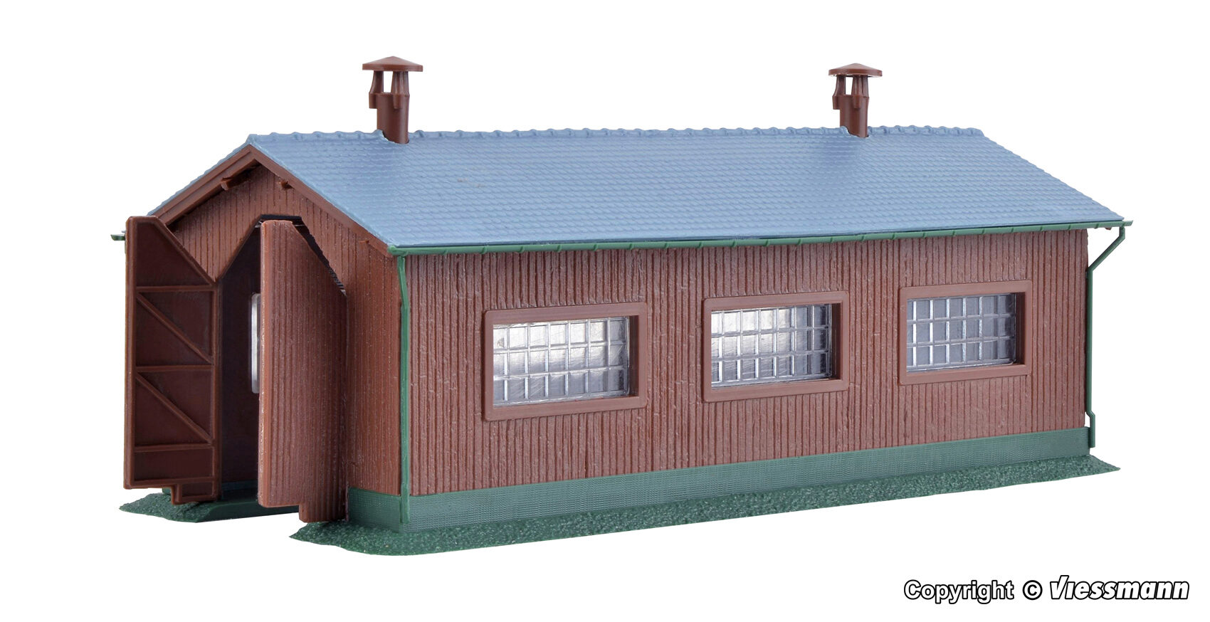 Bausatz. Lokschuppen in Holzbauweise. Die Tore sind manuell beweglich. Maße: L 14 x B 6 x H 6 cm. Schwierigkeitsgrad: 2 (Fortgeschrittene).