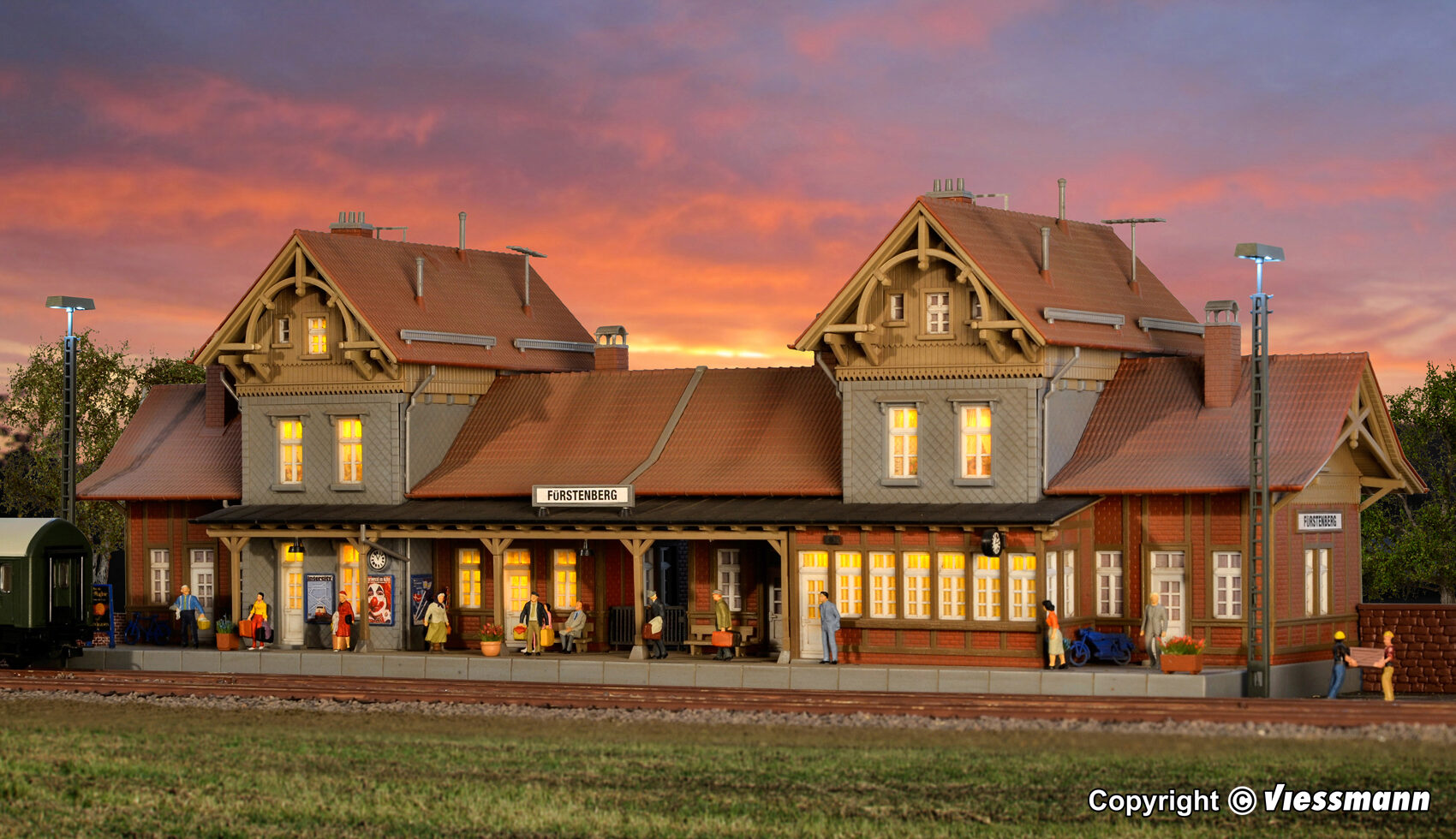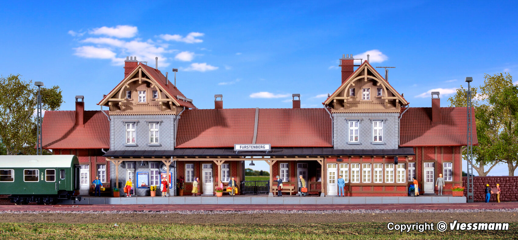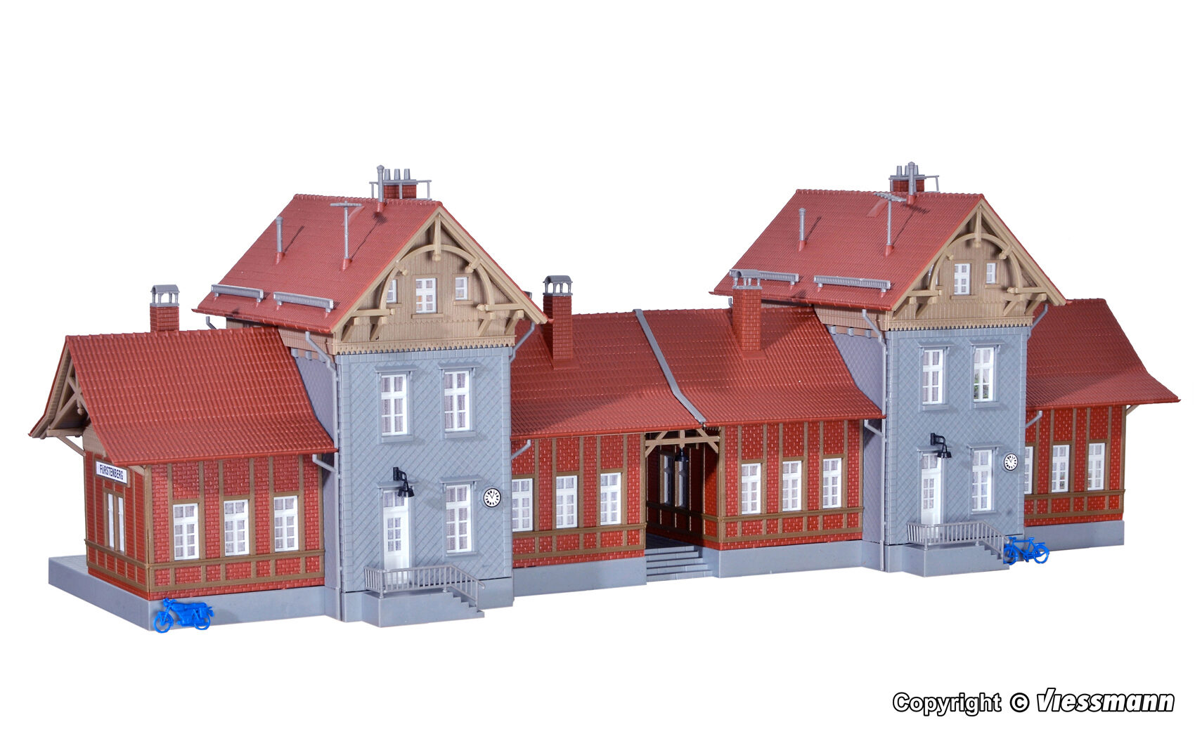 Bausatz. Ein Empfangsgebäude im preußischen Stil, das die damit verbundene Eisenbahnromantik vergangener Epochen verkörpert. Es wurde nach den Richtlinien und Baubestimmungen der Bahn an bestimmten Haupt- und Nebenstrecken erstellt. Das Modell besticht durch seine ausgewogene, symmetrische Architektur und dem Wechselspiel von Farbe und verwendeten Baumaterialien. Ganz besonders reizvoll ist der mittig angeordnete Gebäudedurchgang und die mit Gitterschiebetür gestaltete Bahnsteigsperre. Es fehlt nur noch der fahrkartenzwickende Schaffner. Mit einer Länge von gerade einmal 45 cm findet das imposante Modell auch auf kleineren Anlagen Platz. Mit Stecksystem. Hergestellt im Zweifarben-Spritzgießverfahren. Maße: L 45 x B 15 x H 15,5 cm. Schwierigkeitsgrad: 2 (Fortgeschrittene).