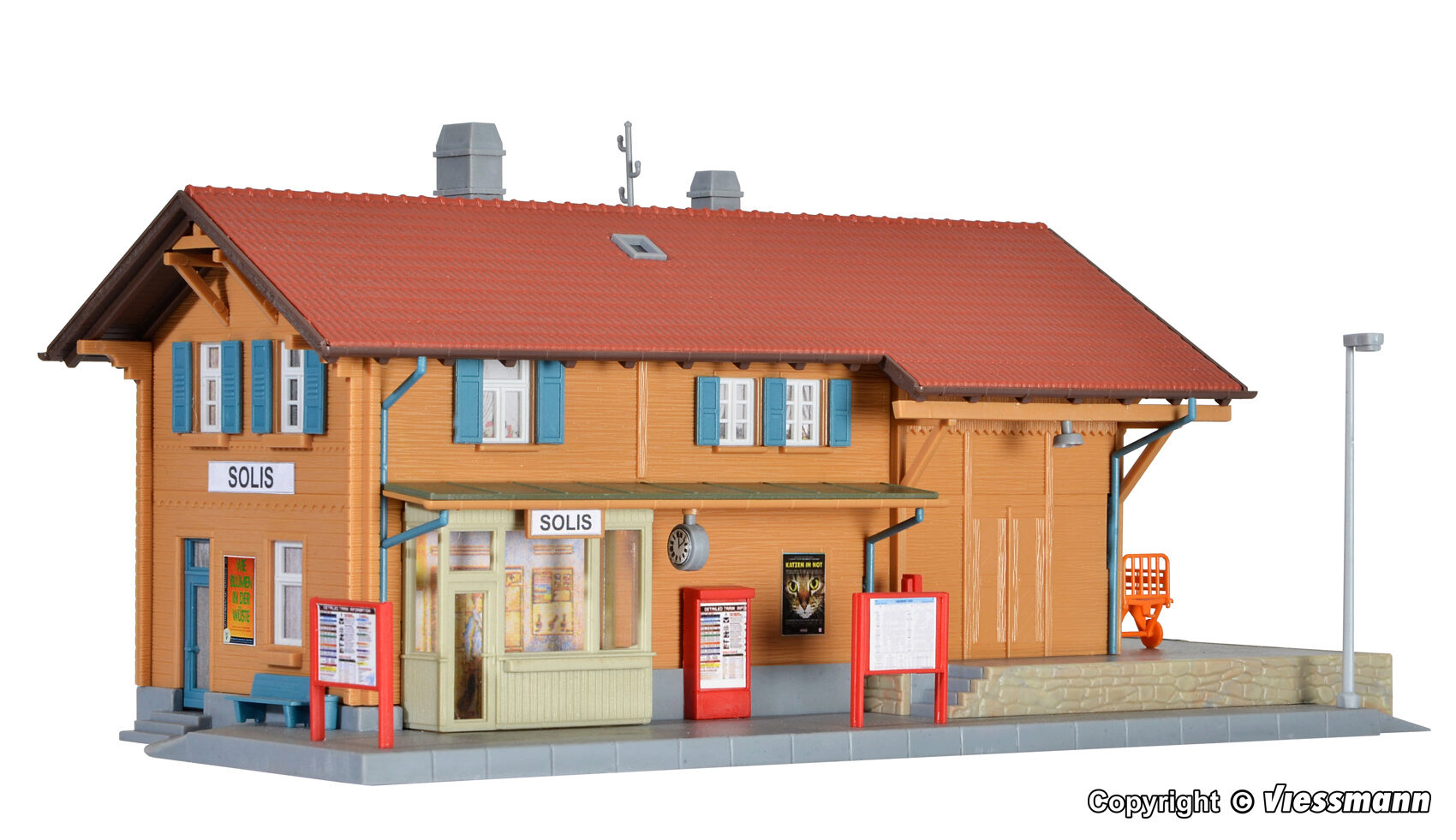 Bausatz. Mit dem kleinen aber sehr gut proportionierten Bahnhofsmodell Solis lassen sich charakteristische ländliche Szenen gestalten. Die Laderampe an der Stirnseite fordert geradezu heraus, einen Holzlagerplatz mit Fahrzeugen aus dem kibri-Programm einzurichten. Mit Stecksystem. Maße: L 31 x B 14 x H 11,5 cm. Schwierigkeitsgrad: 2 (Fortgeschrittene).