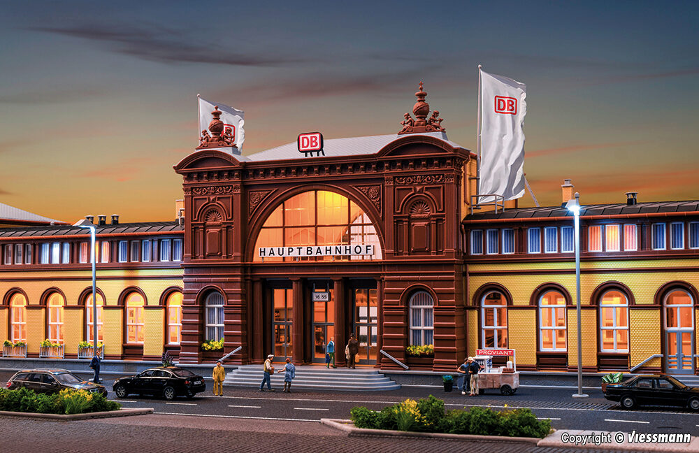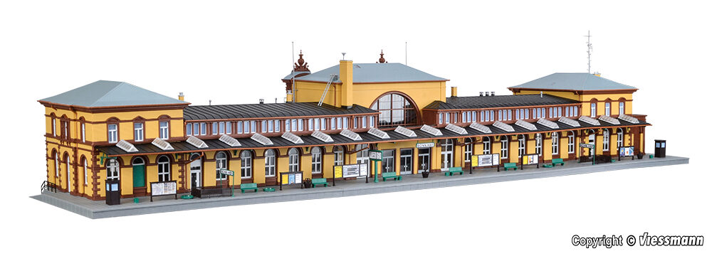 Bausatz. Im Original stellt der Bonner Bahnhof einen typischen Stadtbahnhof dar, der als Durchgangsbahnhof angelegt ist. Bei der Betrachtung des kibri-Modells wird sehr schnell deutlich, warum die 1981 auf der Nürnberger Spielwarenmesse herausgebrachte Neuheit ausnahmslos alle Zuschauer begeisterte. In seinem gesamten Erscheinungsbild stellt der Bahnhof Bonn in Baugröße H0 mit einer Gesamtlänge von fast einem Meter bereits im Bausatz mit über 500 Einzelteilen ein Superlativ dar. Nicht nur die Maßstabstreue, auch die Mustergültigkeit lässt sich auf die gesamte Architektur übertragen. Mit seinem Mittel- und den beiden Eckbauten sowie der Bahnsteig- und Straßenseite, entspricht das Modellgebäude im H0-Maßstab dem Vorbild in allen wesentlichen Einzelheiten bis hin zur gekonnt angelegten Farbgebung. Durch die respektable Größe ist dieser Bausatz für jede H0-Anlage ein toller Blickfang. Im Modell besticht er in seiner Gesamtproportion als auch mit seinen zahlreichen Details in Form von Ecken und Winkeln. Der Bausatz wird ergänzt durch eine ganze Reihe von Zubehörteilen aus dem kibri-Sortiment für die Ausgestaltung von Gebäuden und Bahnsteigen, z. B. der Bahnsteighalle Bonn Art. 39565. Hallen und Bahnsteige sind dem C-Gleissystem von Märklin angepasst, eine Erhöhung der Bahnsteige macht sie wie in Wirklichkeit ICE-fähig. Maße: L 98,5 x B 25,5 x H 23 cm. Schwierigkeitsgrad: 3 (Profis).