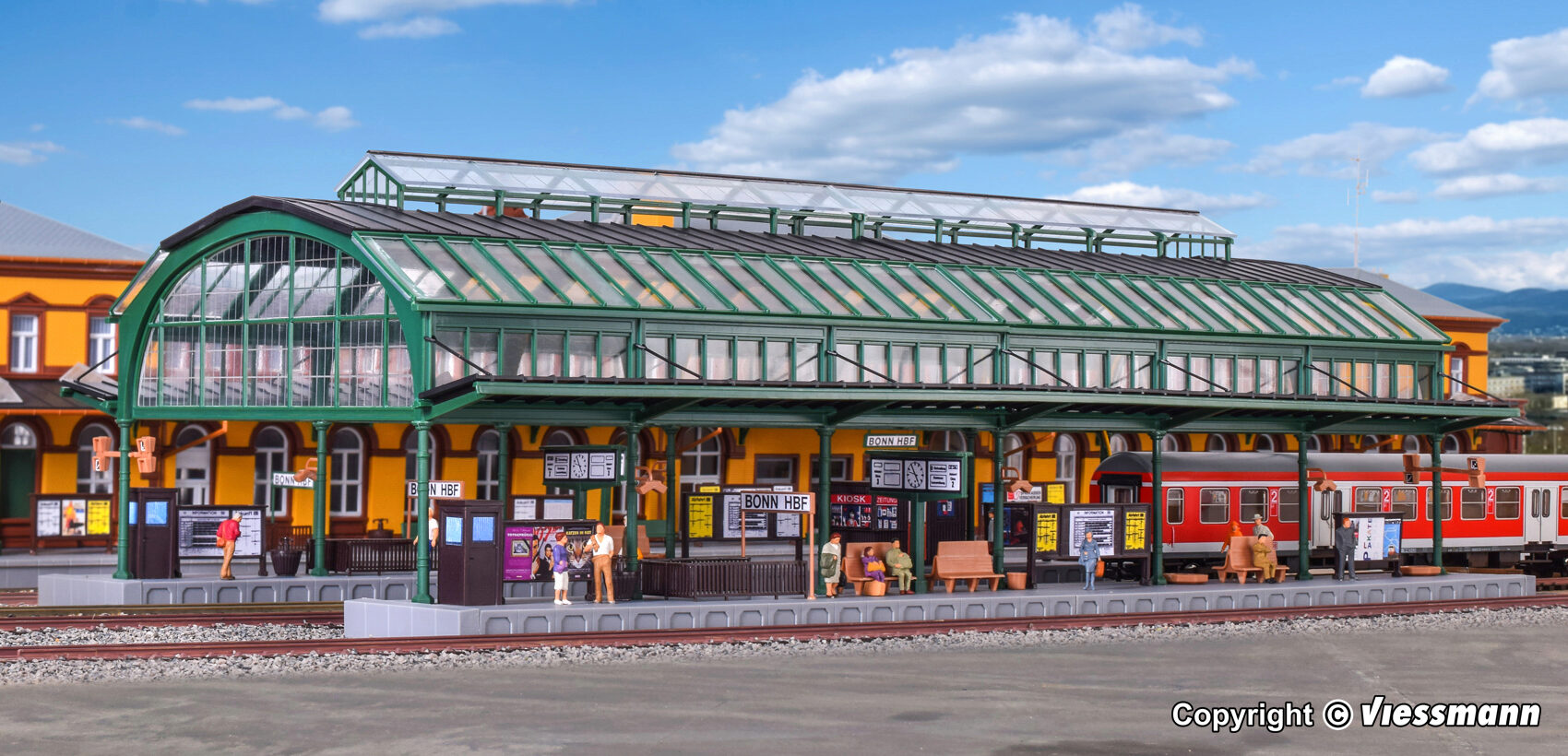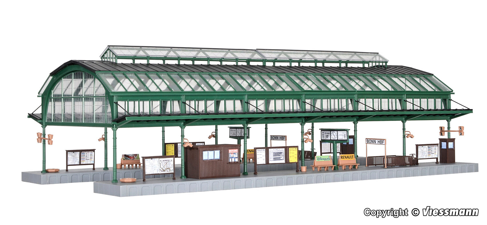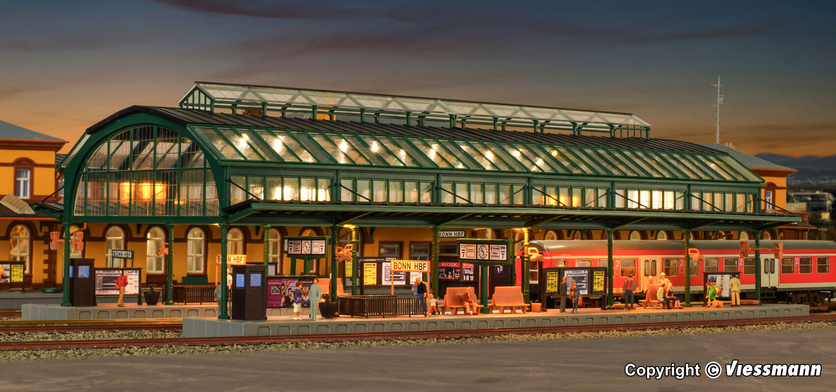 Bausatz. Diese gigantische Bahnsteighalle passt wunderbar zum Modell des großen Bahnhofs Bonn Art. 39373. Gleise und Bahnsteige werden hier von einer interessanten Hallenkonstruktion raumwirksam überdeckt. Das Eisen-Glas-System ist auch im Modell hervorragend nachempfunden. Das Konzept folgt in der Zusammenstellung einem Großstadtbahnhof im H0-Maßstab. Mehrere Hallen können in beliebiger Länge und Breite hinter- bzw. nebeneinander aufgebaut werden, wobei sie je nach Wunsch oder vorhandener Anlage als Durchgangs- oder Kopfbahnhof eingesetzt werden können. Der Aufbau der gewölbten Dachkonstruktion bereitet im Modell keine Schwierigkeiten, lediglich die Montagereihenfolge der einzelnen Dachteile spielt eine Rolle. Geeignet für den Aufbau mit der Viessmann-Oberleitung. Geeignet für Modellgleise und Märklin C-Gleis. ICE-Erhöhung liegt bei. Durchfahrtshöhe: 5,5/11,5 cm. Durchfahrtsbreite: 11,5 cm. Maße: L 44 x B 22,3 x H 13,5 cm. Schwierigkeitsgrad: 2 (Fortgeschrittene).