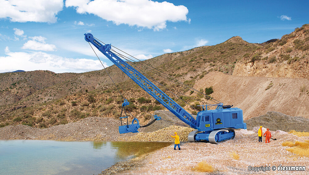 Bausatz. Vorbilddaten: Motorleistung 123 kW/167 PS, Gewicht ca. 48,5 t, Auslegerlänge 15,25 m, Kübelinhalt 1,7 m³. Maße: L 21 x B 4 x H 5 – 19 cm. Schwierigkeitsgrad: 2 (Fortgeschrittene).