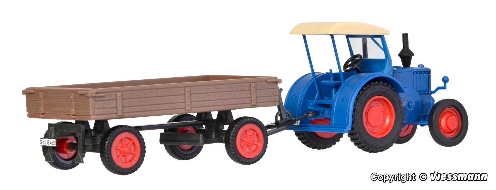 Bausatz. Vorbilddaten: Einzylinder-Zweitaktmotor mit Glühkopf und Schlitzsteuerung, eine Stunde Höchstleistung bei 26 kW/35 PS, Dauerleistung 22 kW/30 PS. Hergestellt im Zweifarben-Spritzgießverfahren. Im Viessmann Sortiment auch als Funktionsmodell Art. 1167 erhältlich (ohne Anhänger). Maße: L 10 x B 2,3 x H 2,7 cm. Schwierigkeitsgrad: 2 (Fortgeschrittene).