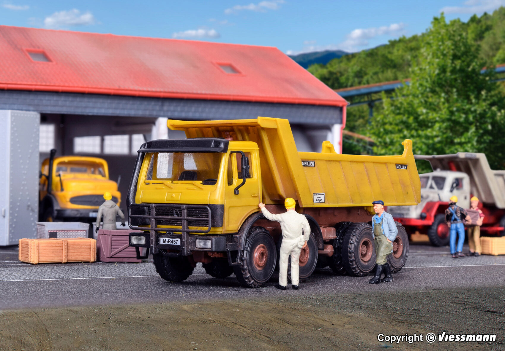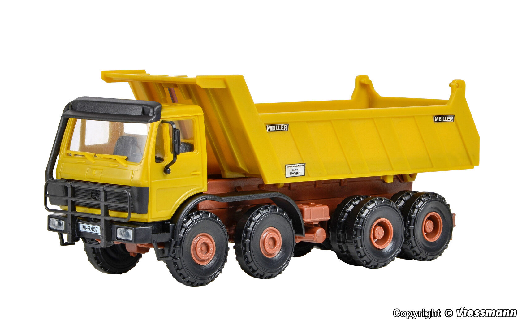 Bausatz. Vorbilddaten: MERCEDES-BENZ 4-achs Zugmaschine 2636K, 261 kW/355 PS mit MEILLER Hinterkippermulde, Nutzlast ca. 17,5 t. Maße: L 10 x B 3,5 x H 3,9 – 9 cm. Schwierigkeitsgrad: 2 (Fortgeschrittene).