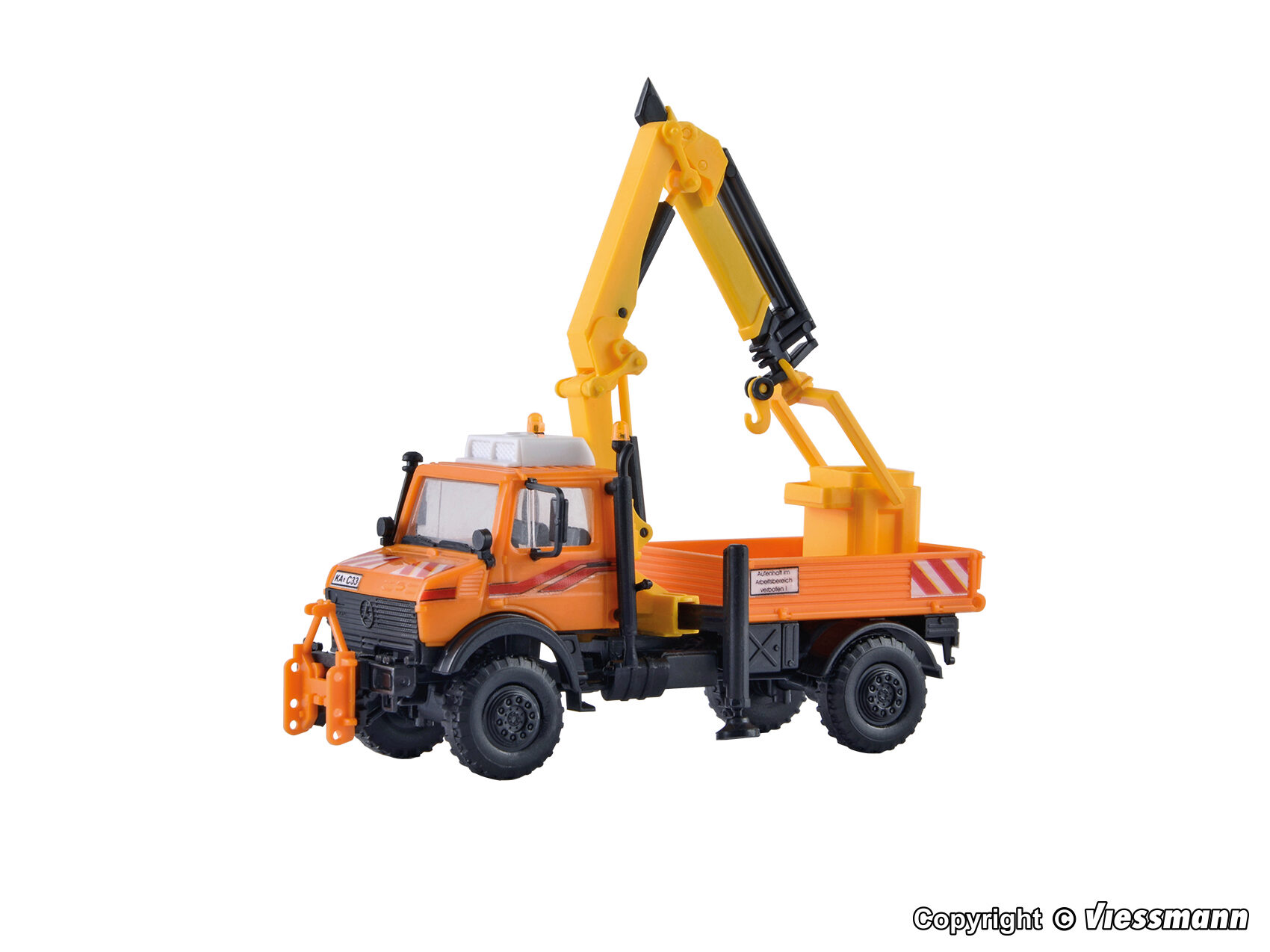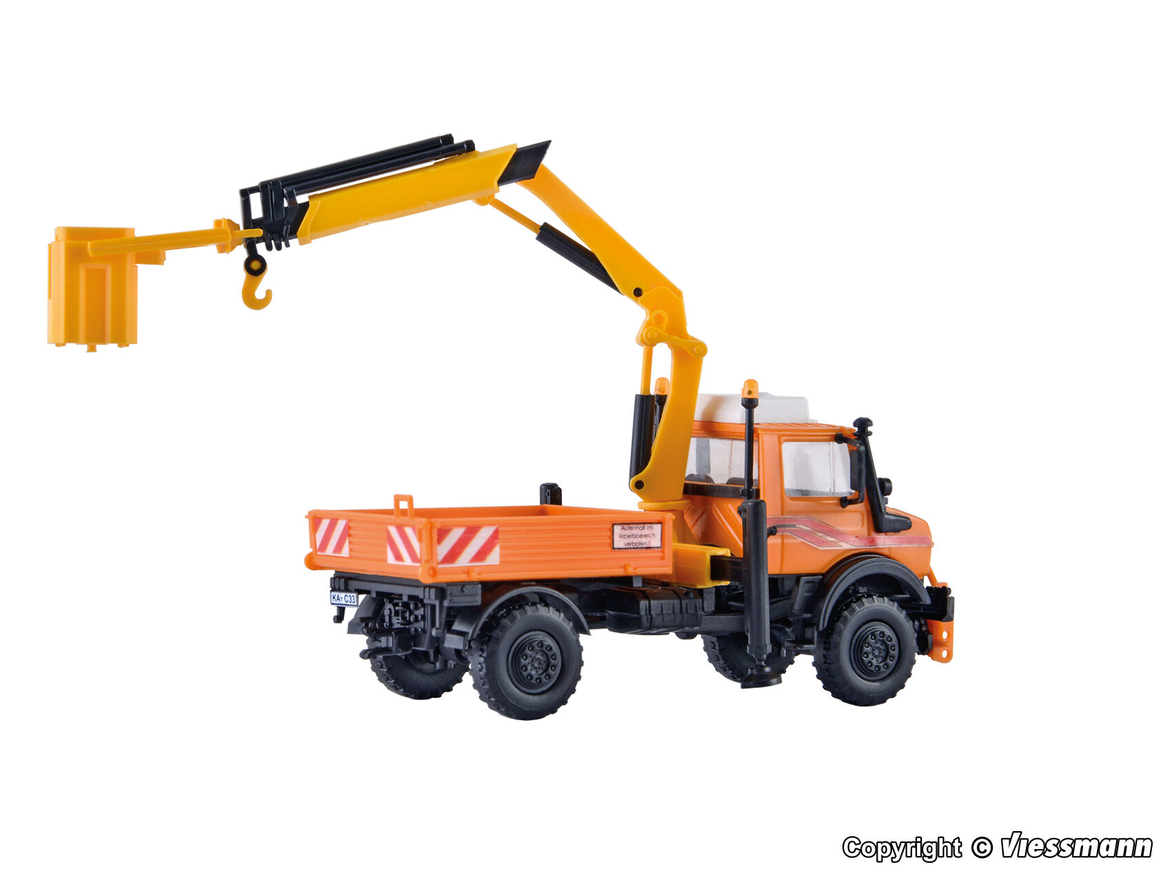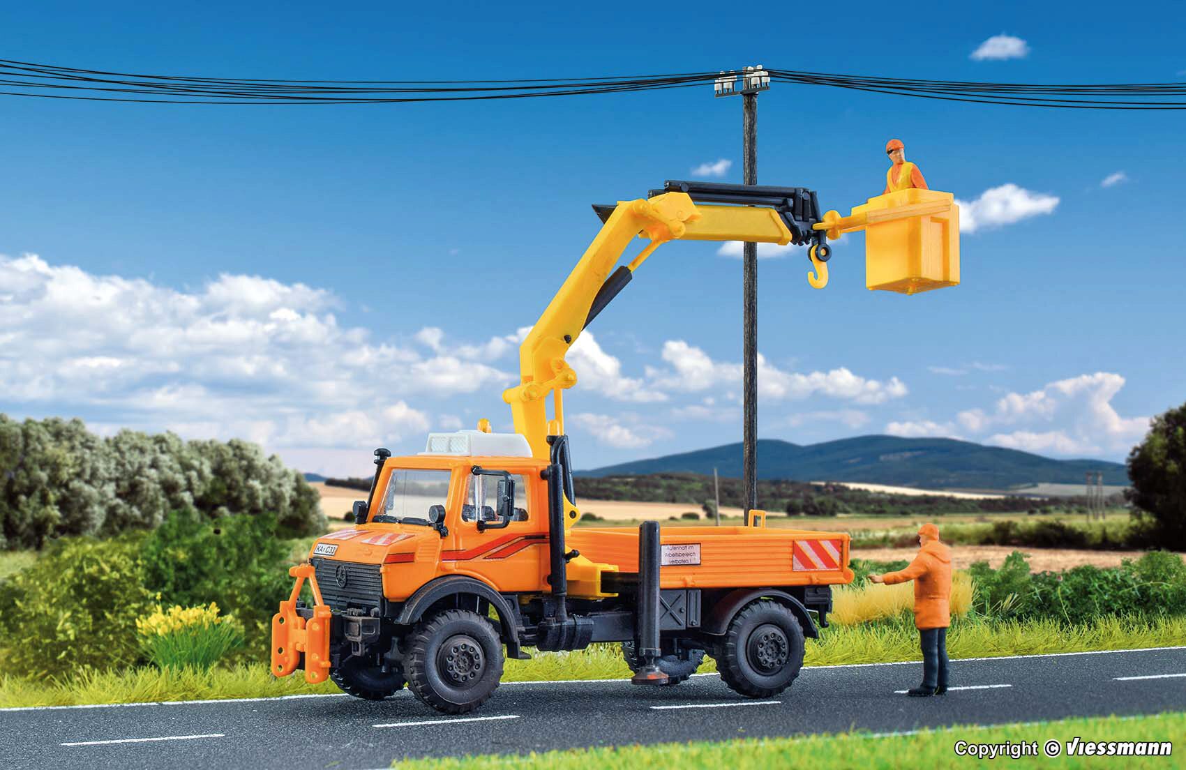Bausatz. Vorbilddaten: MB UNIMOG U 2450 L, 6 Zylinder Dieselmotor 177 kW/240 PS, Radstand 3,85 m, Ladeluftkühler, Turbolader, PALFINGER Ladekran mit Lasthaken und Arbeitskorb. Maße: L 7 x B 3,2 x H 4 – 10 cm. Schwierigkeitsgrad: 2 (Fortgeschrittene).