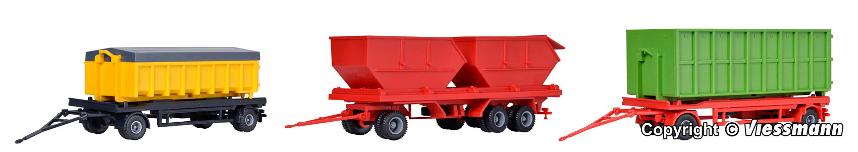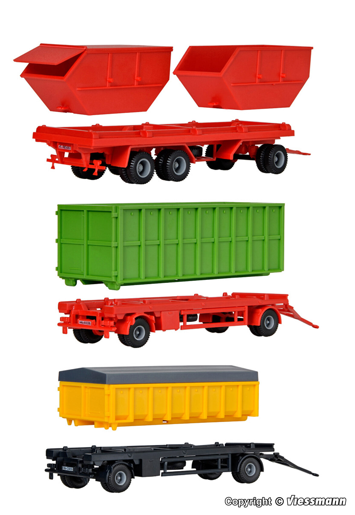 Bausatz. Vorbilddaten: MEILLER Transportanhänger Typ KMT 18/1 (B/L), Abrollbehälter, Muldeninhalt ca. 15 m³, Spezialanhänger für Gesteinsmulden mit je 10 m³ Inhalt. Maße: L 12 x B 3 x H 3,7 cm, L 11 x B 3,1 x H 3,4 cm, L 11 x B 3,1 x H 3,7 cm. Schwierigkeitsgrad: 2 (Fortgeschrittene).