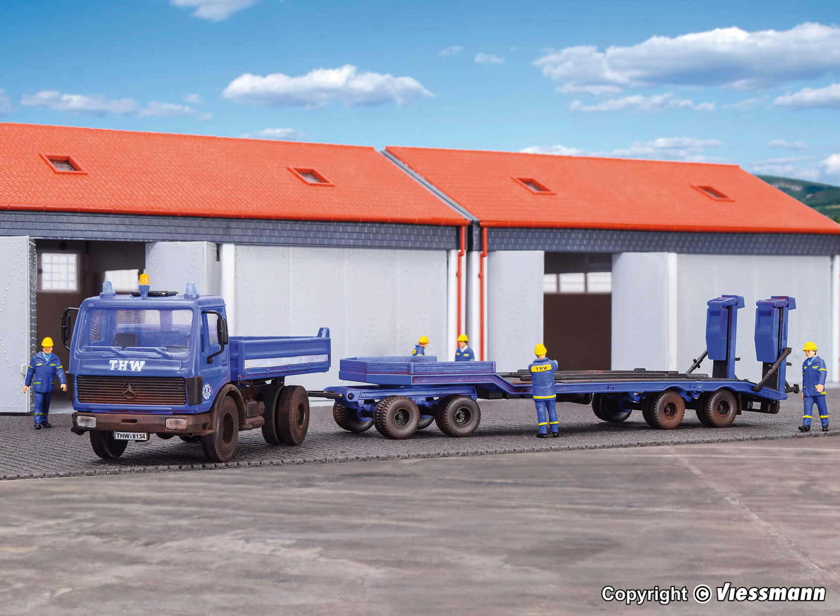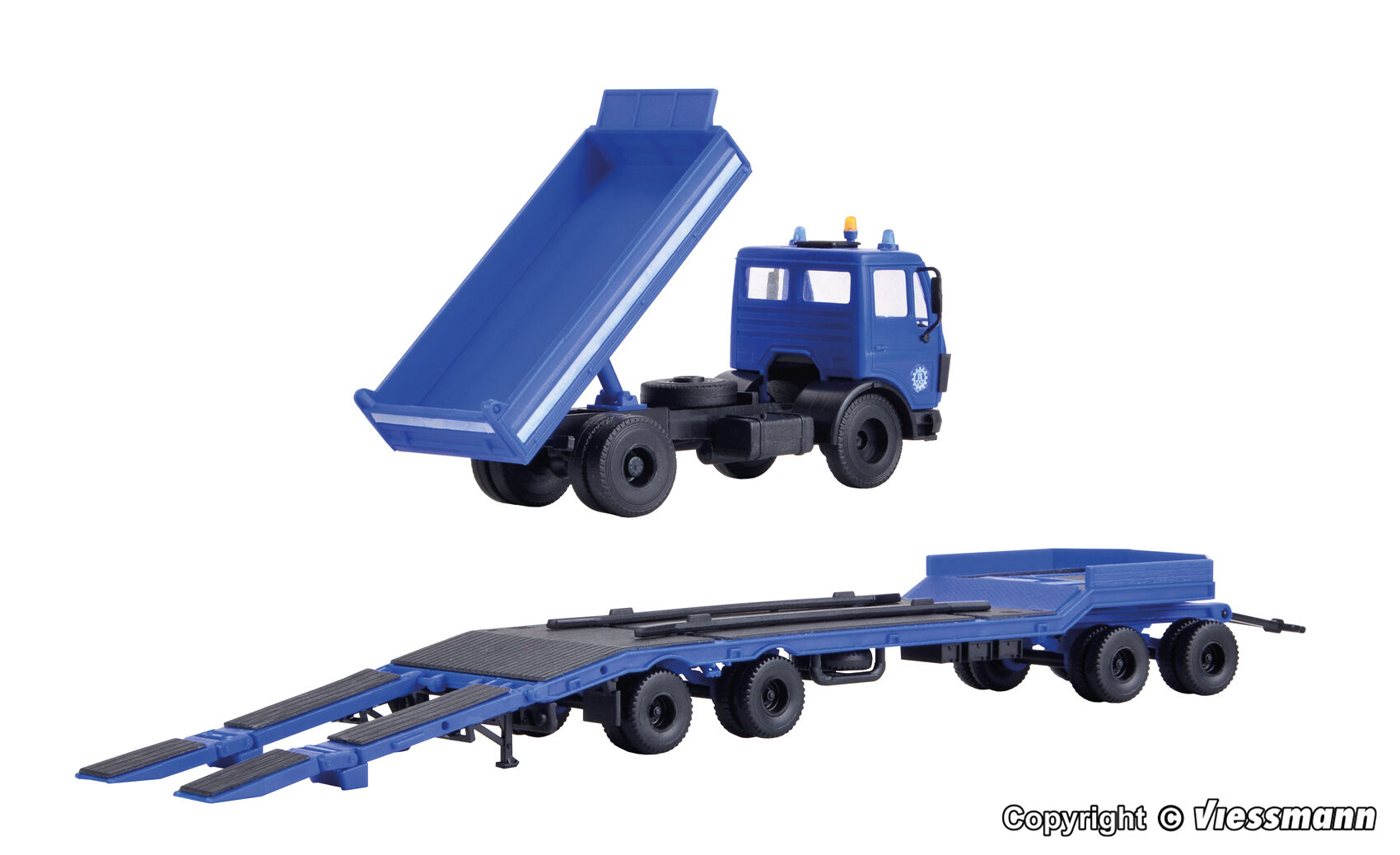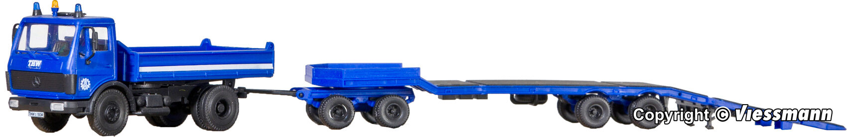 Bausatz. Vorbilddaten: MERCEDES-BENZ 1936 K, 261 kW/355 PS Dieselmotor, Nutzlast ca. 7,2 t, Gesamtgewicht 16 t, MÜLLER Tiefladeanhänger T4, Nutzlast 31,5 t, Gesamtgewicht 40 t. Maße: L 20,9 – 24,1 x B 3,3 x H 3,6 cm. Schwierigkeitsgrad: 2 (Fortgeschrittene).