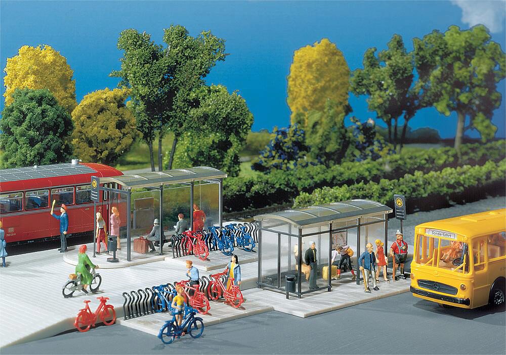 Die Packung enthält die im Original von der Fa. Team Tejbrant entwickelten und realisierten Modelle einer geschlossenen und offenen Haltestelle sowie zwei Fahrradständern mit Fahrrädern.