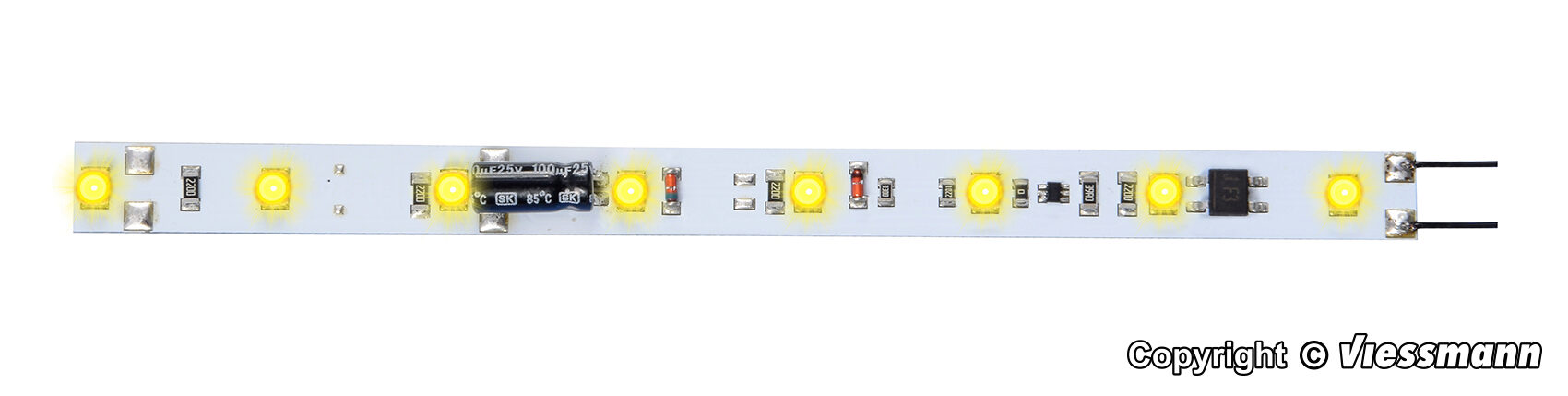Kürzbare Innenbeleuchtung mit 8 weißen, wartungsfreien LEDs. Konstantstromquelle integriert, für Flackerschutz vorbereitet. Gleichmäßige Ausleuchtung durch kleinen LED-Abstand. Geeignet für Waggons aller Hersteller, die für Innenbeleuchtung vorgesehen sind. Betrieb mit Gleich-, Wechsel- und Digitalstrom. Stromaufnahme im Betrieb max. 30 mA. Maße: L 13,2 x B 0,9 cm.