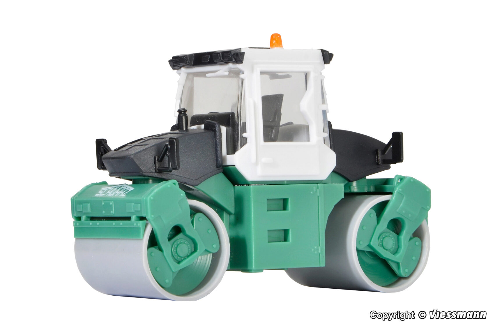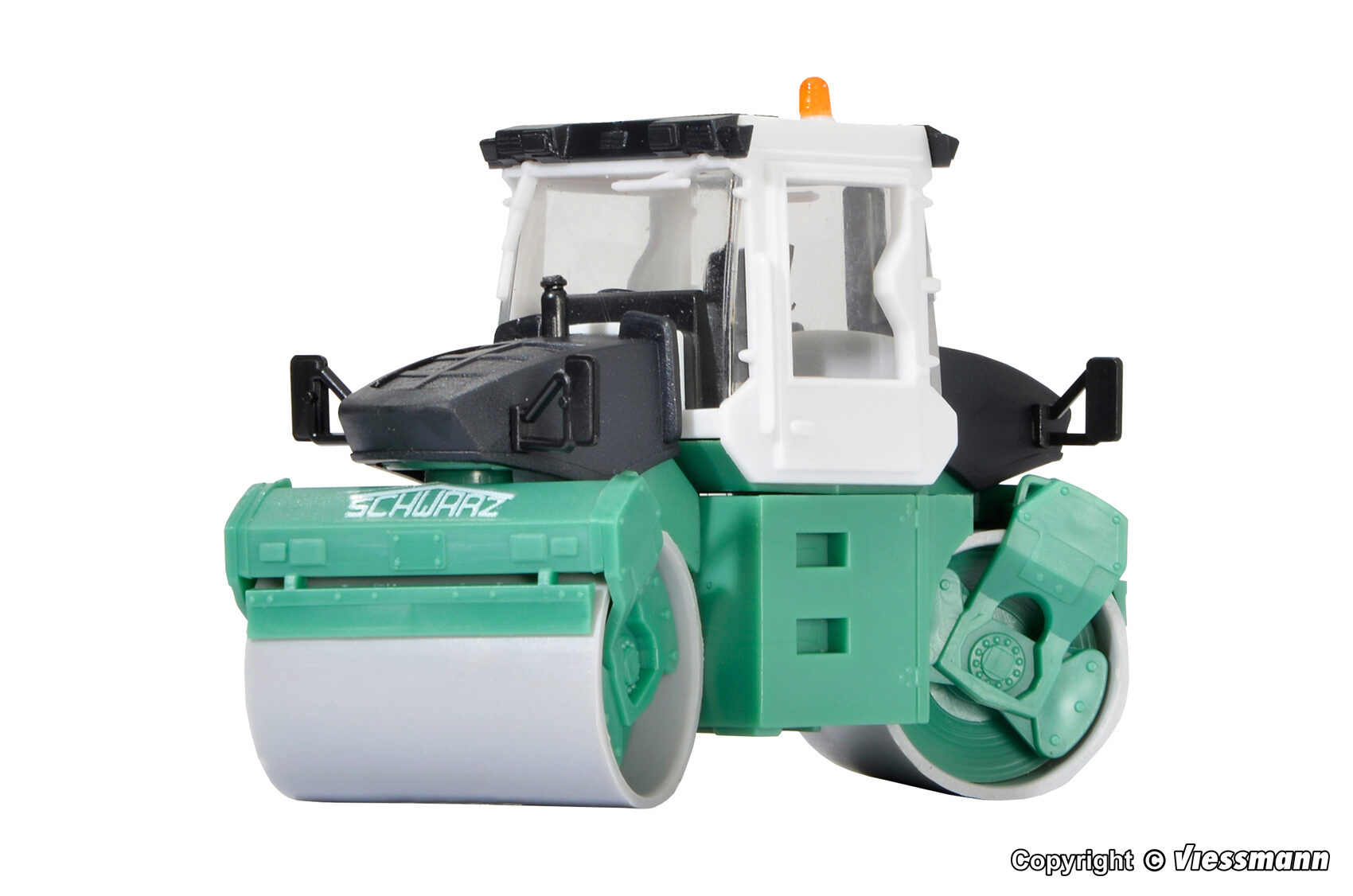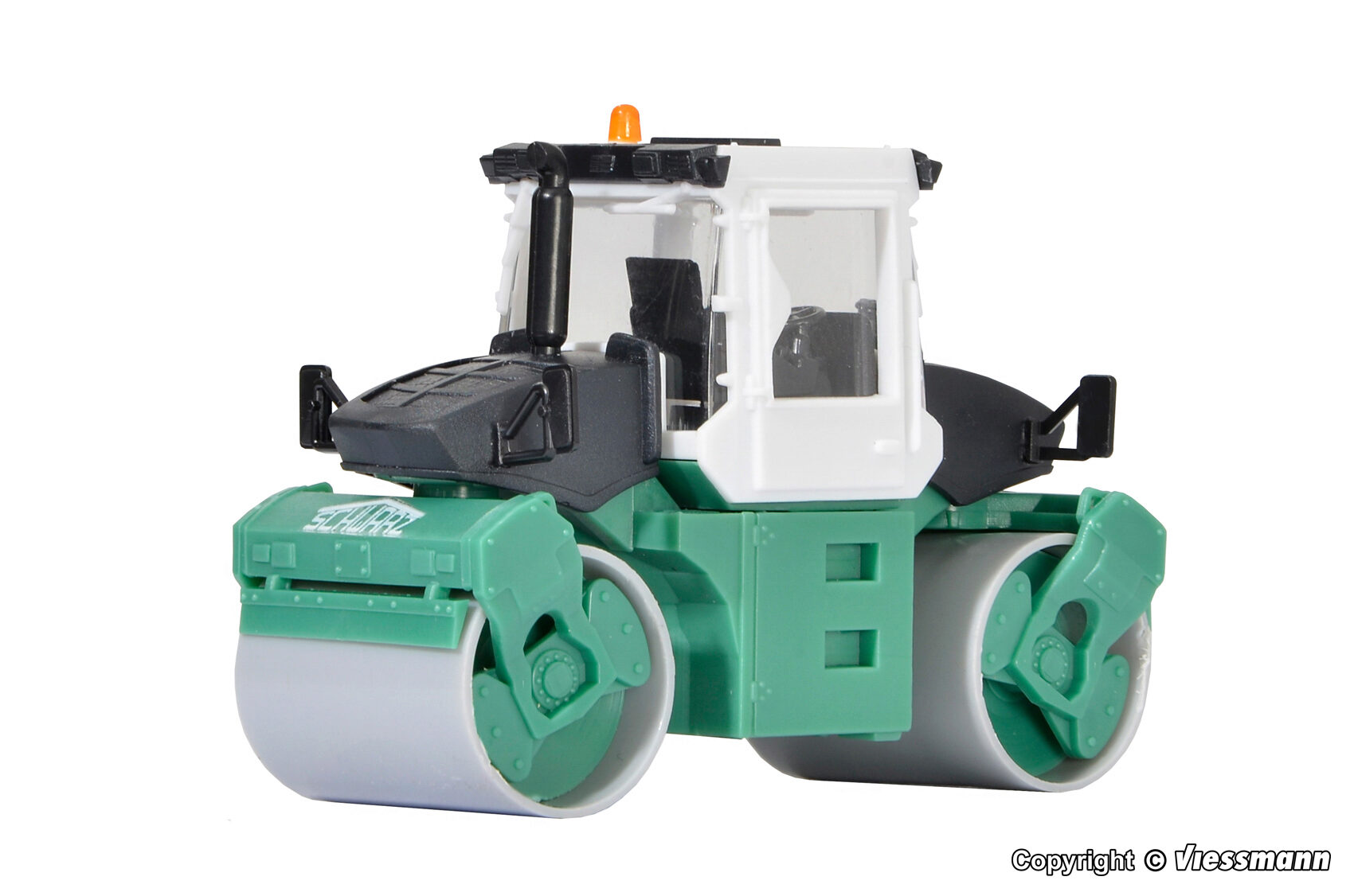 Bausatz. Vorbilddaten: Tandemwalze Typ BW 170 AD, 4 Zylinder Cummins-Dieselmotor 4B 3.3, wassergekühlt, 53 kW/80 PS, Eigengewicht 8 t, Betriebsgewicht 9,5 t, Walzenbreite 1,68 m – max. 3 m durch Hundegang, max. Verdichtungskraft 5,5 t je Bandage. Dazu passt der DEMAG Straßendeckenfertiger SchwarzBau Art. 11658. Maße: L 5 x B 2,4 x H 3,8 cm. Schwierigkeitsgrad: 2 (Fortgeschrittene).