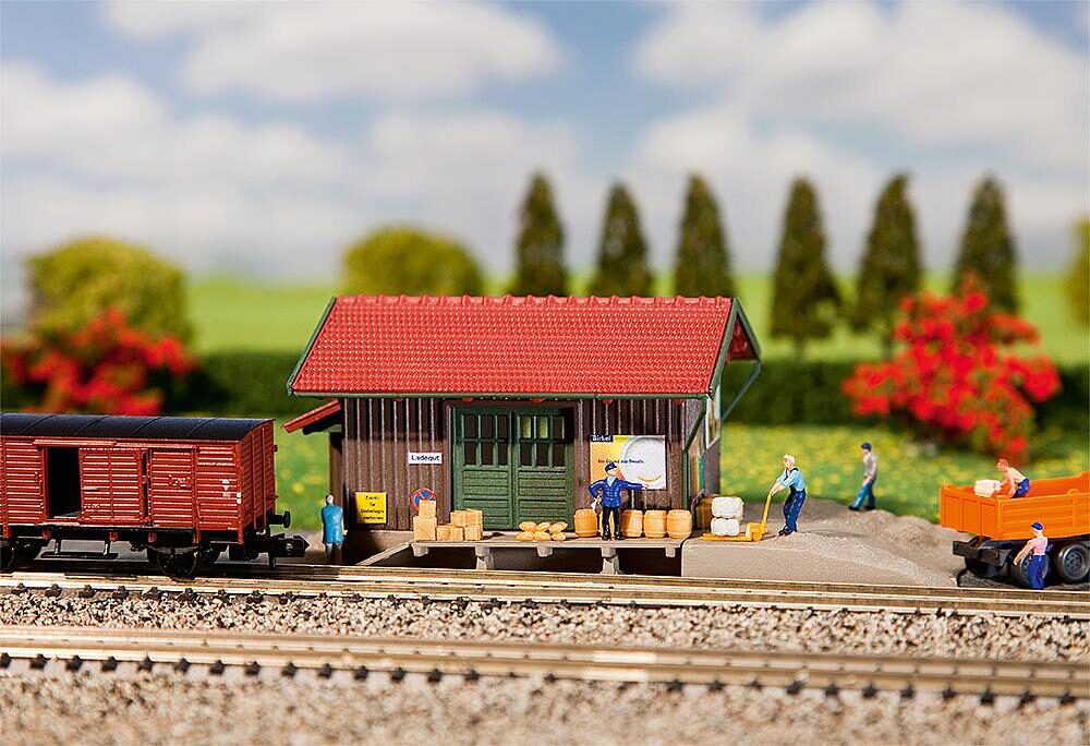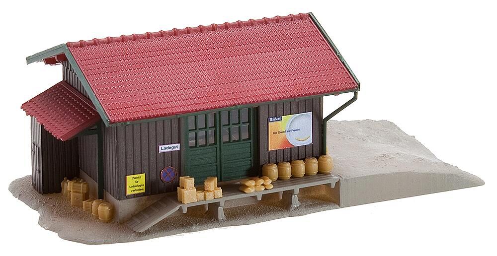 Güterschuppen in Holzbauweise, mit Verladerampe und seitlicher Auffahrtsschräge.