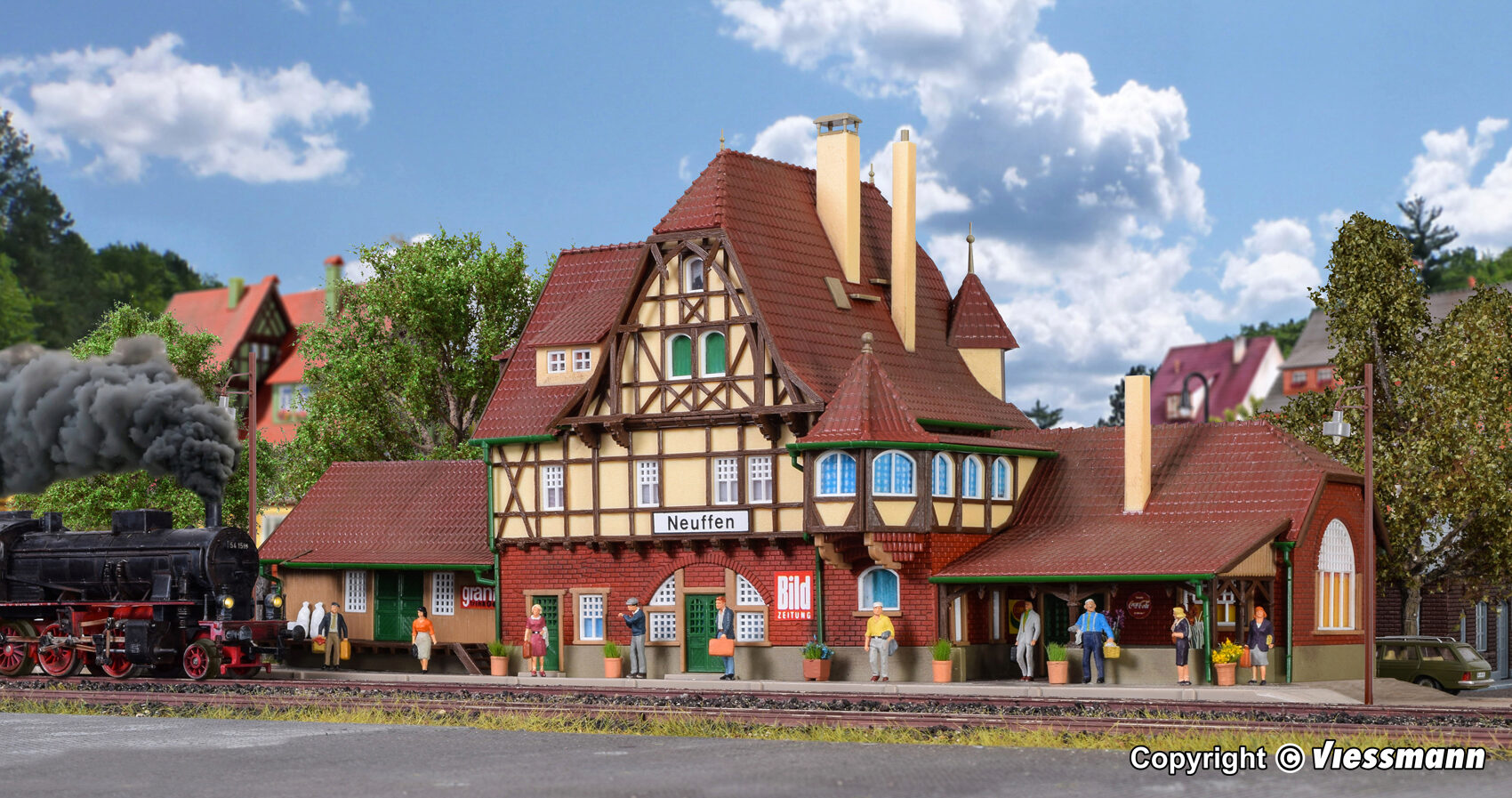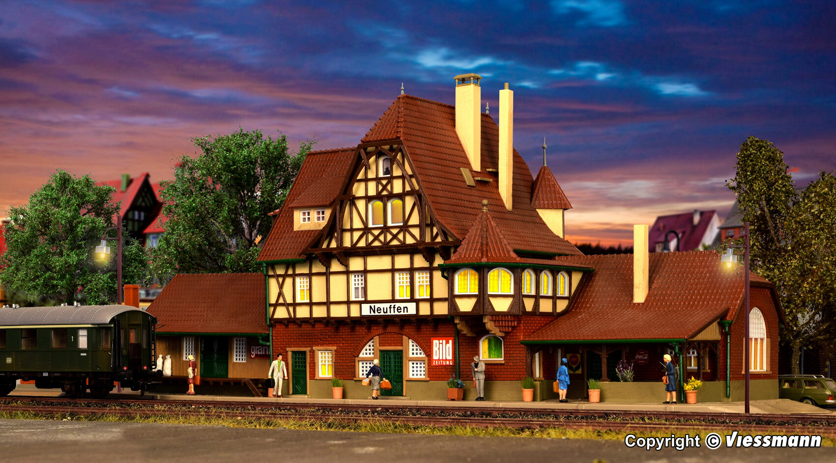 Der Bahnhof Neuffen ist ein typischer Landbahnhof. Er ist Endstation der Nebenlinie Nürtingen-Neuffen und steht am Fuß der Burgruine Hohen-Neuffen auf der Schwäbischen Alb. Das kurz vor der Wende zum 20. Jahrhundert errichtete, stilechte Bahnhofsgebäude wurde von Vollmer mit allen Details nachgebaut. Maße: L 41 x B 14 x H 16,5 cm.