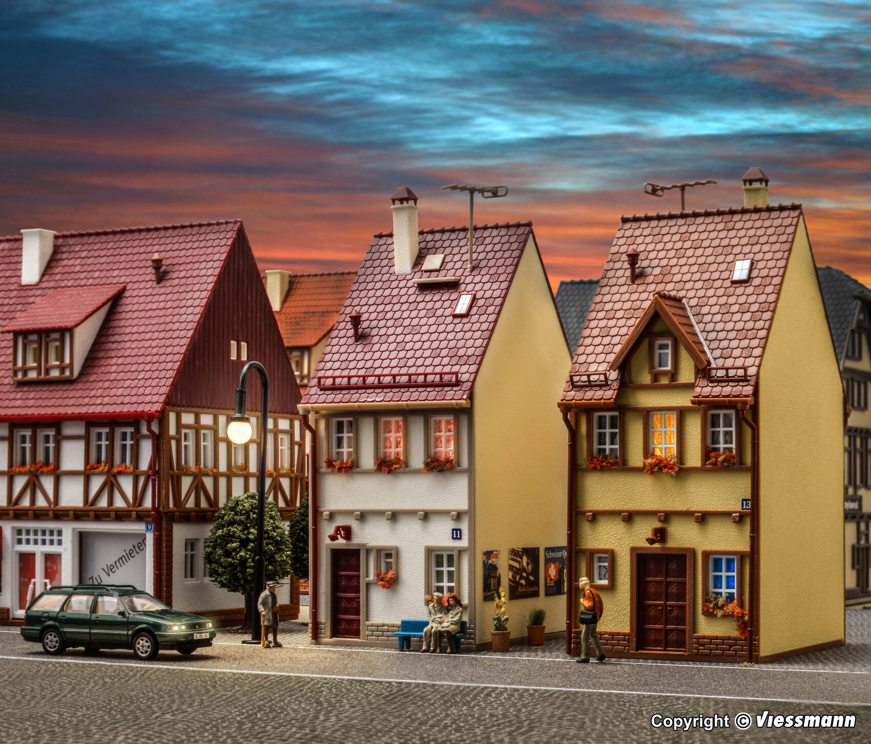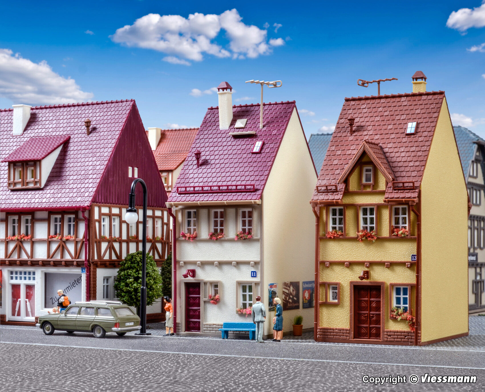 Mit den Bausätzen der Vollmer Bahnhofstraße 9 – 19 können Sie einen kompletten Straßenzug mit Wohn-, Geschäfts- und Fachwerkhäusern gestalten. Bereits mit 4 Bausätzen schaffen Sie sich eine preiswerte und abwechslungsreiche Häuserfront. Maße: L 8,3 x B 5,2 x H 13 cm.