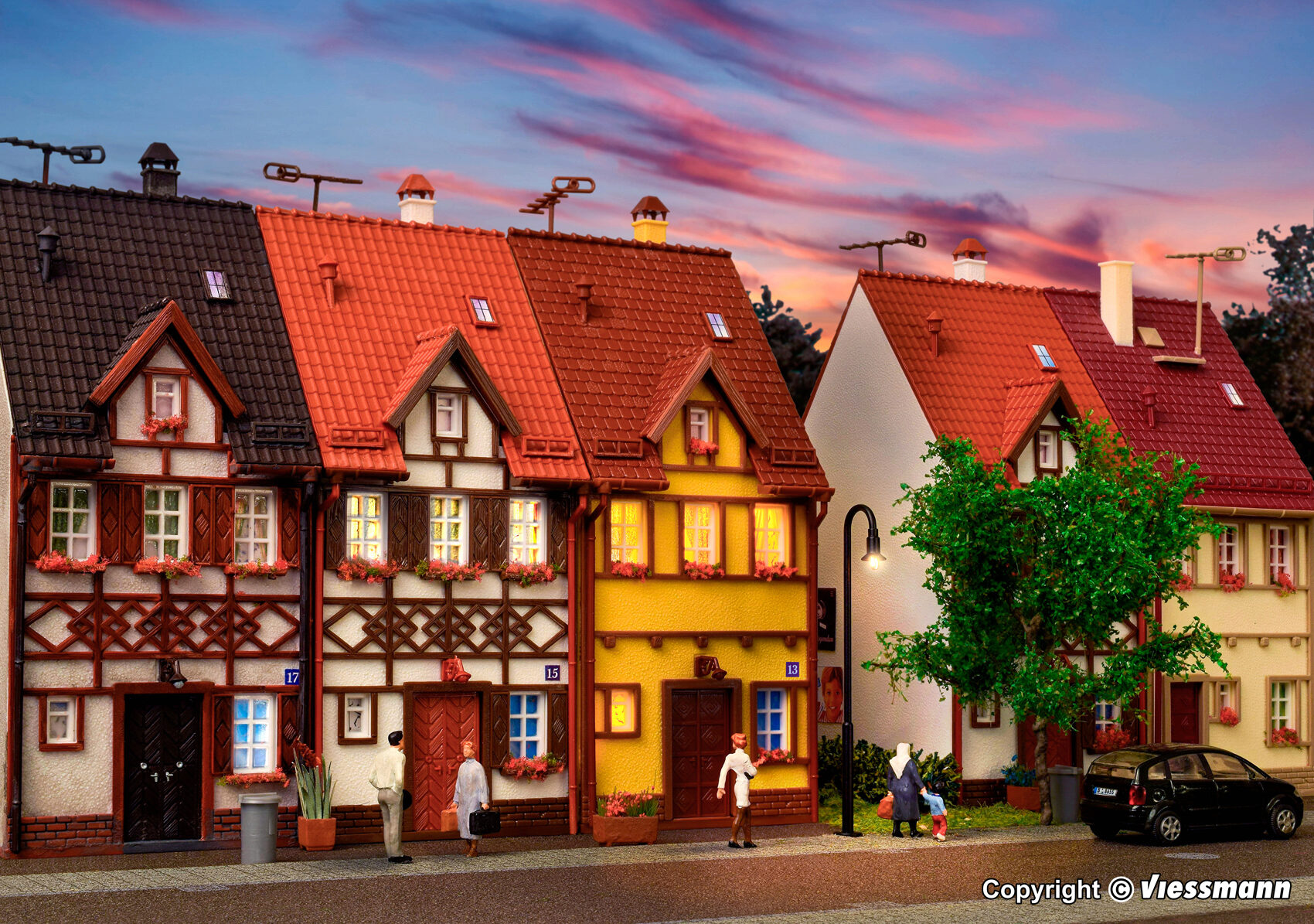 Mit den Bausätzen der Vollmer Bahnhofstraße 9 – 19 können Sie einen kompletten Straßenzug mit Wohn-, Geschäfts- und Fachwerkhäusern gestalten. Bereits mit 4 Bausätzen schaffen Sie sich eine preiswerte und abwechslungsreiche Häuserfront. Maße: L 5,2 x B 8,2 x H 13 cm.