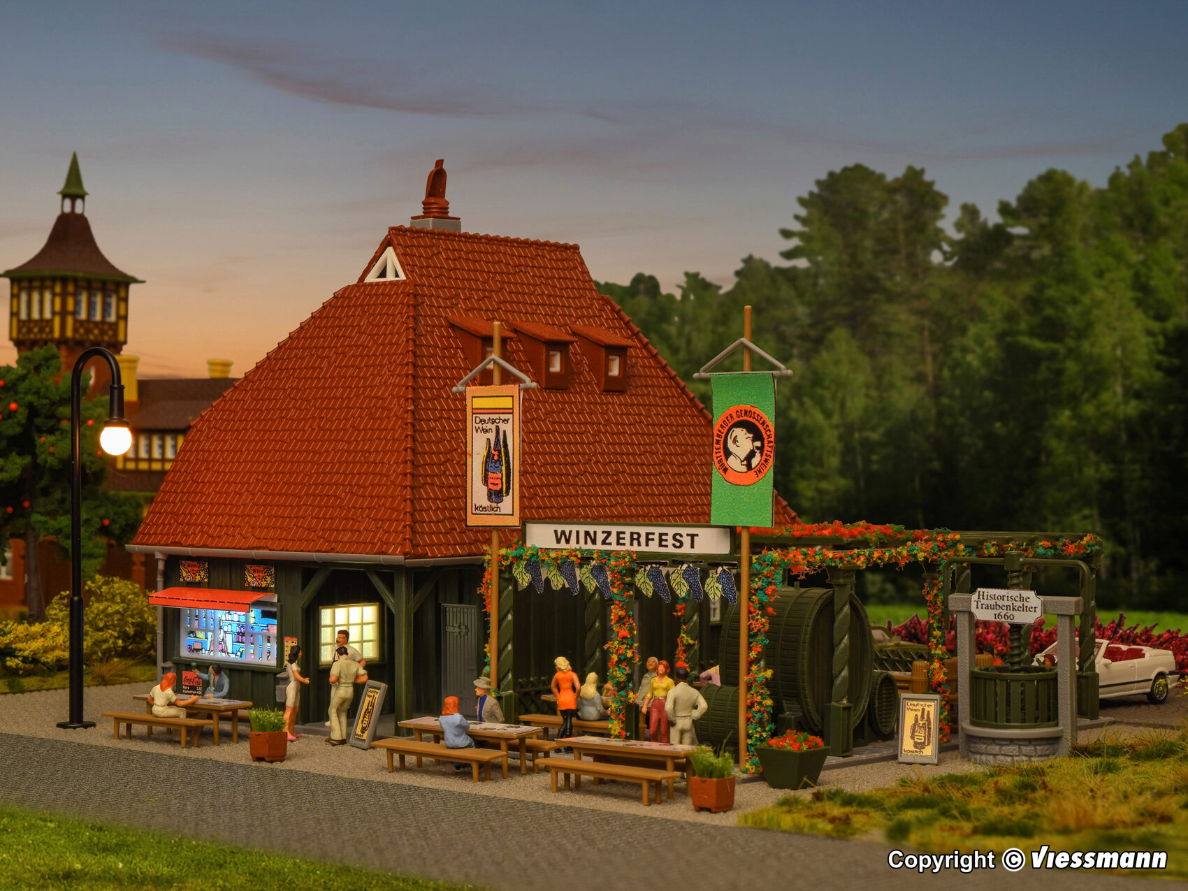 Lassen Sie sich von der weinseligen Stimmung und der urigen Gemütlichkeit anstecken. Der Bausatz ist mit vielen stimmungsvollen Details ausgestattet, z. B. einer historischen Weinkelter und einer Außenterrasse mit Weinfässern und Bänken. Maße: L 14,2 x B 16 x H 13 cm.