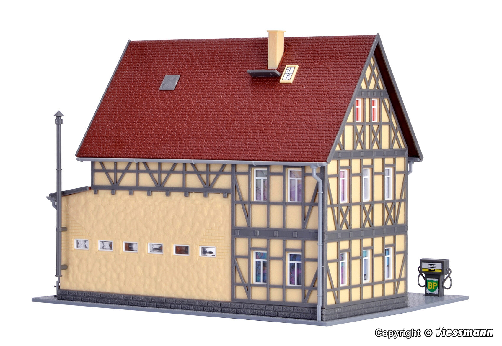 Mit Dieselzapfsäule, Hebebühne und weiterem Zubehör. Eine LED zur Innenbeleuchtung der Werkstatt liegt dem Bausatz bei. Maße: L 15,8 x B 12,5 x H 12 cm.