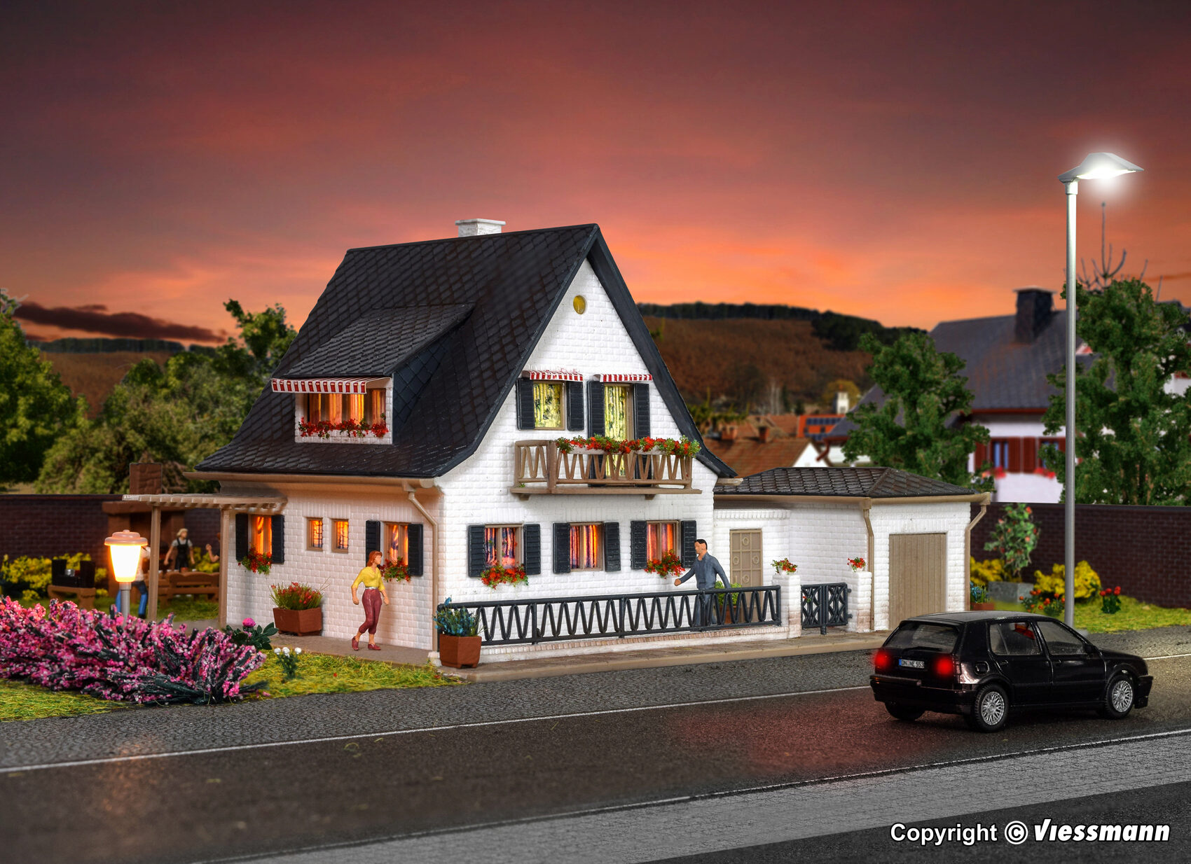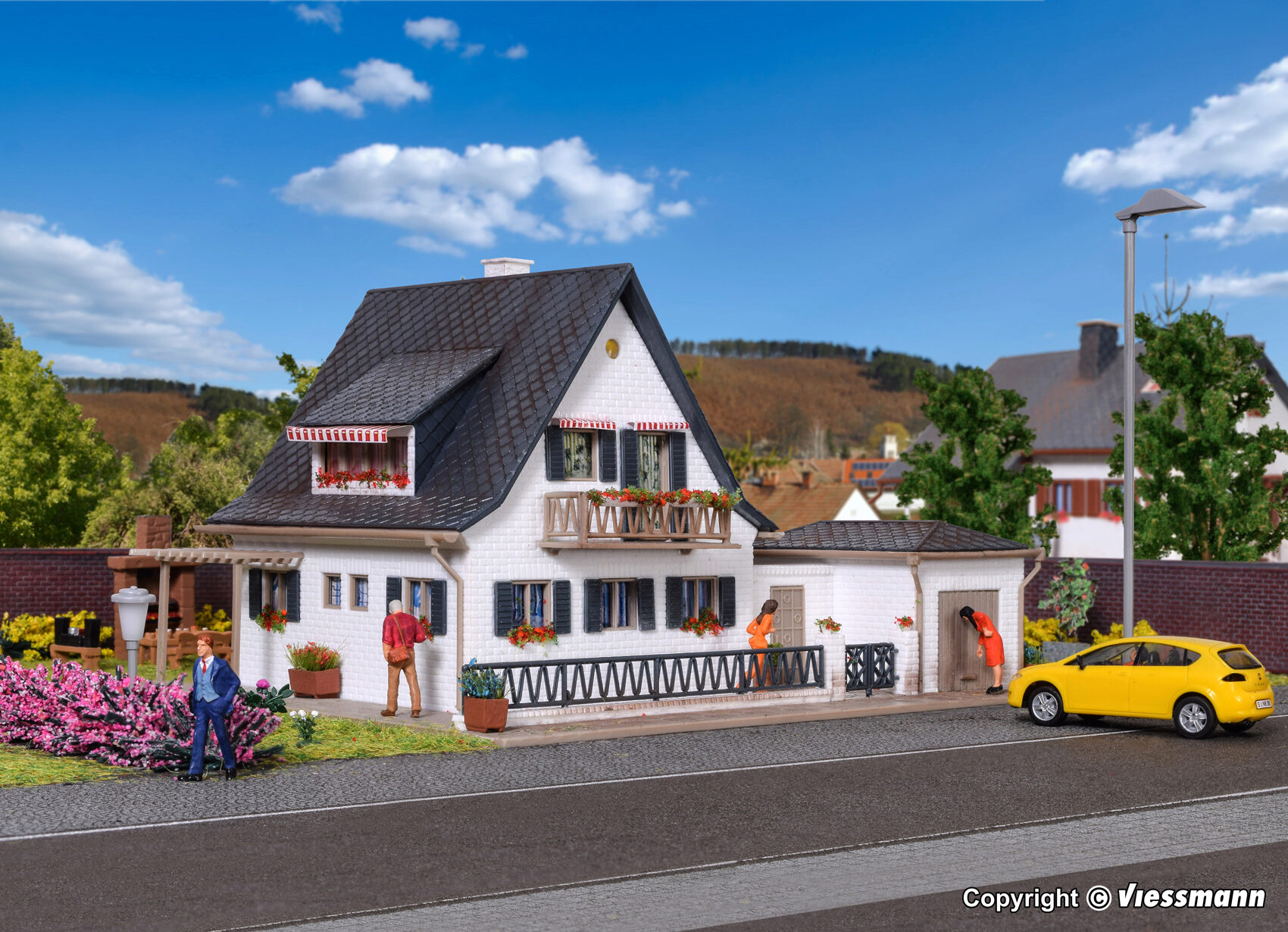 Mit Balkon, Terrasse und Gartenzaun. Maße: Wohnhaus L 11,5 x B 12 x H 8,8 cm, Garage L 7,7 x B 4,5 x H 3,7 cm.