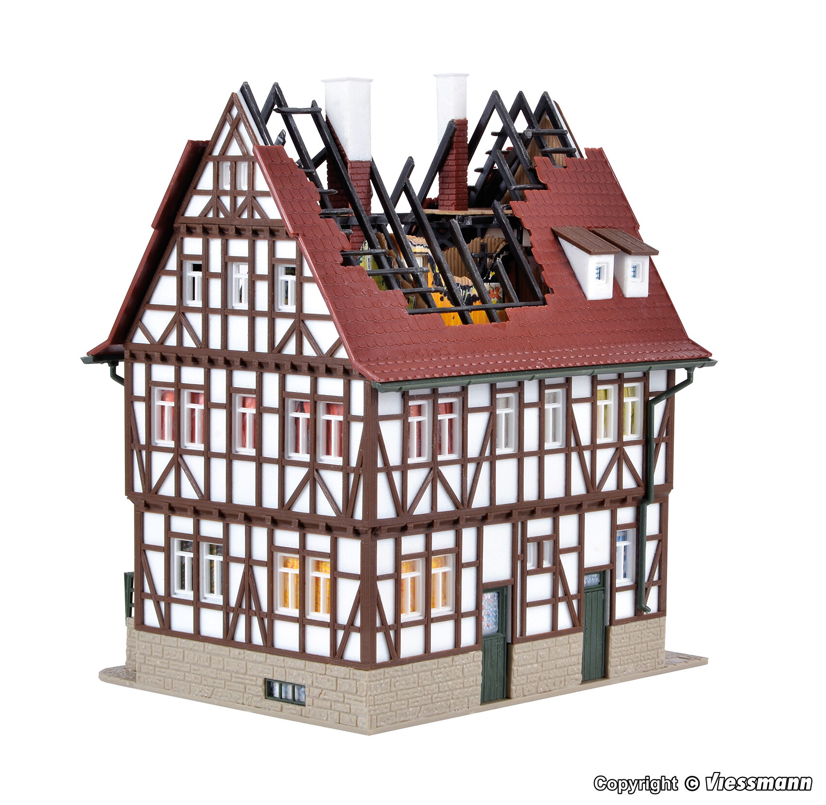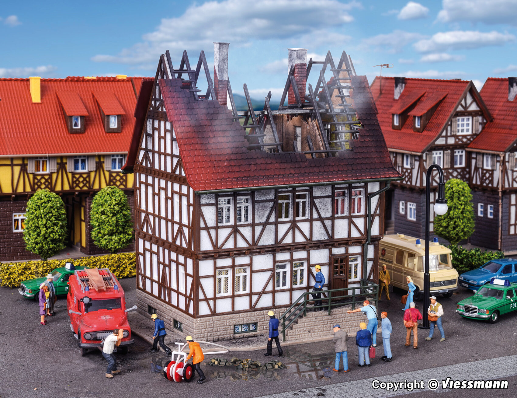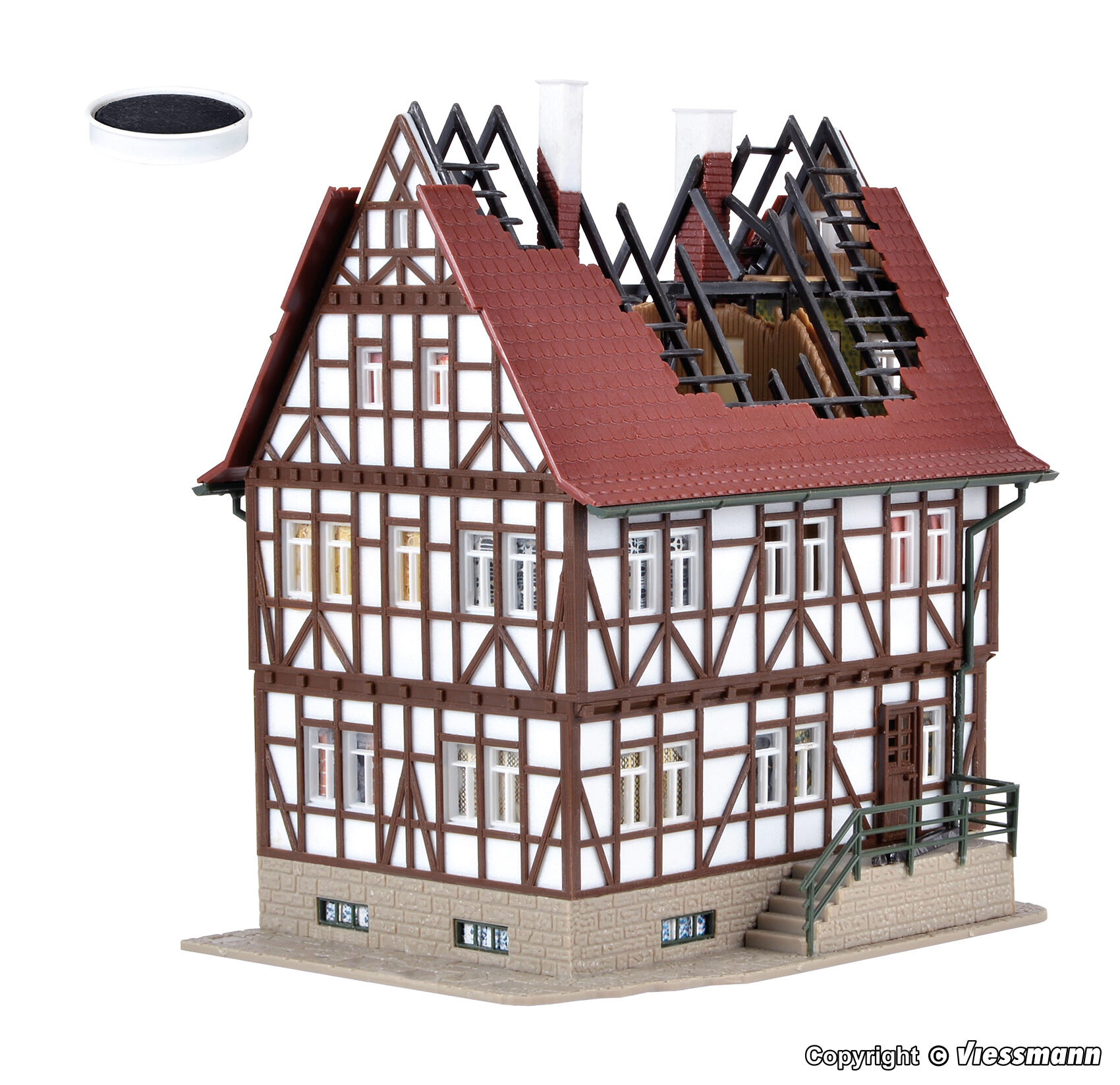 Dieses Gebäude mit ausgebranntem Dachstuhl kann mit der beiliegenden Farbtablette individuell gealtert werden. Mit den Rauchgeneratoren aus dem Vollmer Sortiment, z. B. Art. 44114, und einem passenden Rauchdestillat erzeugen Sie den passenden Rauch. Maße: L 12 x B 10 x H 14 cm.